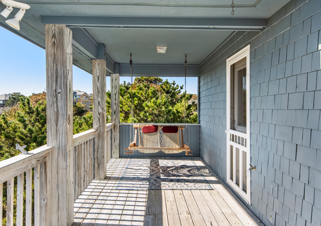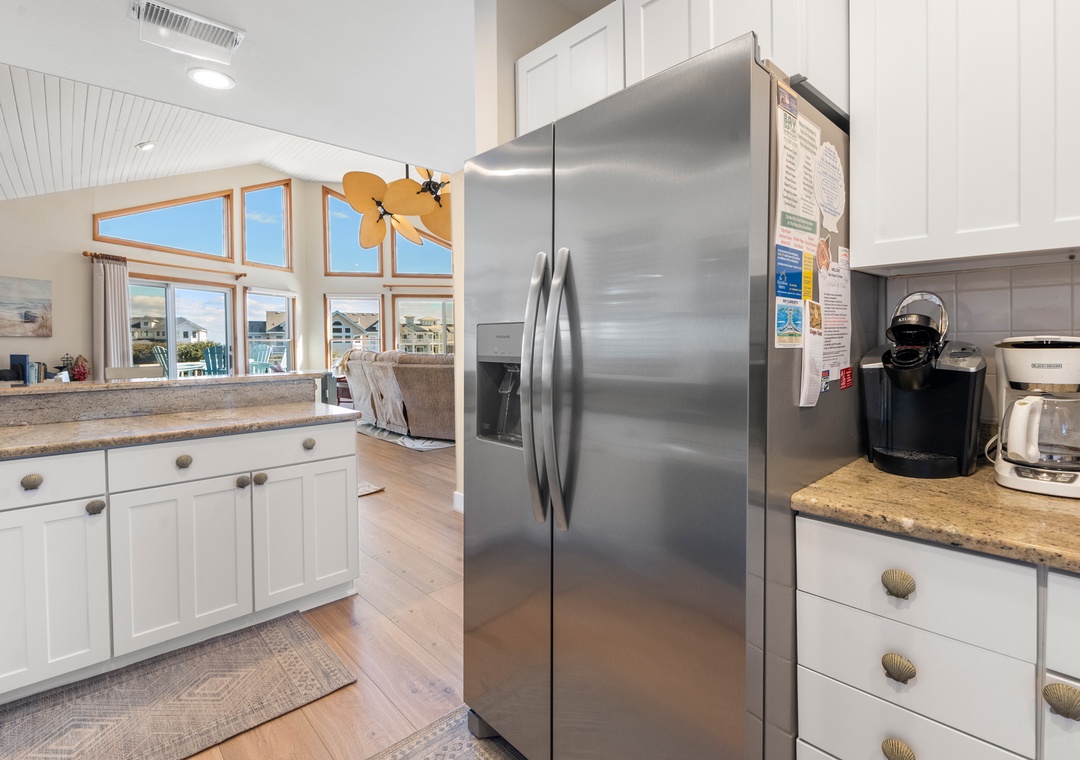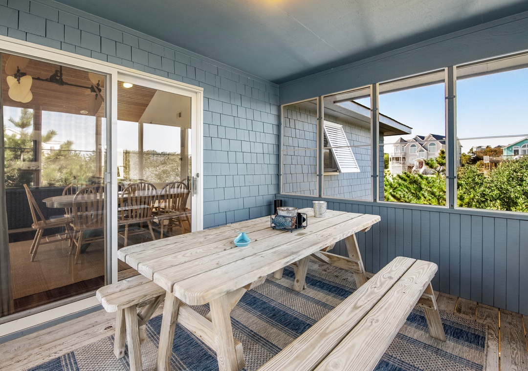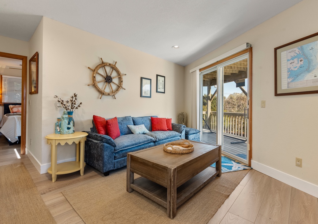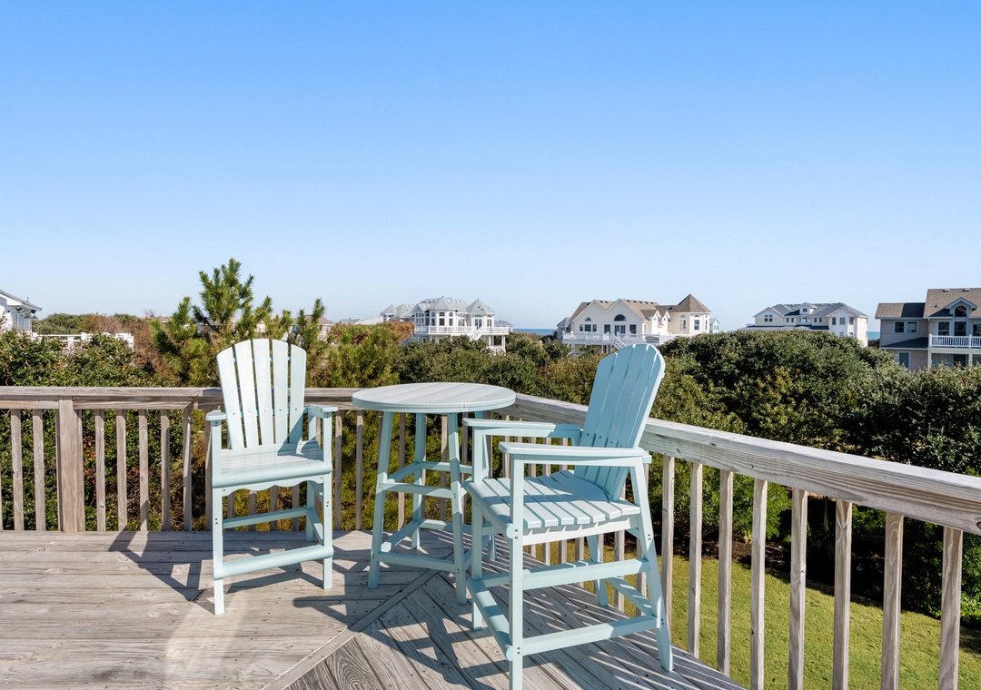 When you come home from the beach, relax in the comfortably furnished living area featuring an open-concept layout, hardwood flooring and vaulted ceilings. It leads out to an east-facing sun deck where you can enjoy a horizon view of the ocean and a refreshing coastal breeze. When you're not dining out, prepare meals in the well-stocked kitchen and serve at the dining table for eight or al fresco on the screened porch. The top-level primary bedroom also provides deck access as well as an ensuite bath for plenty of privacy. Three additional bedrooms on the mid-level (including a second ensuite) will comfortably accommodate family and friends, and the den can be used as a second living area or kid's hangout space.