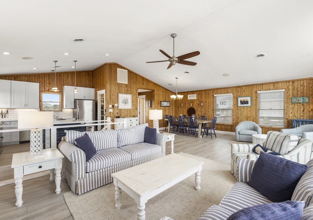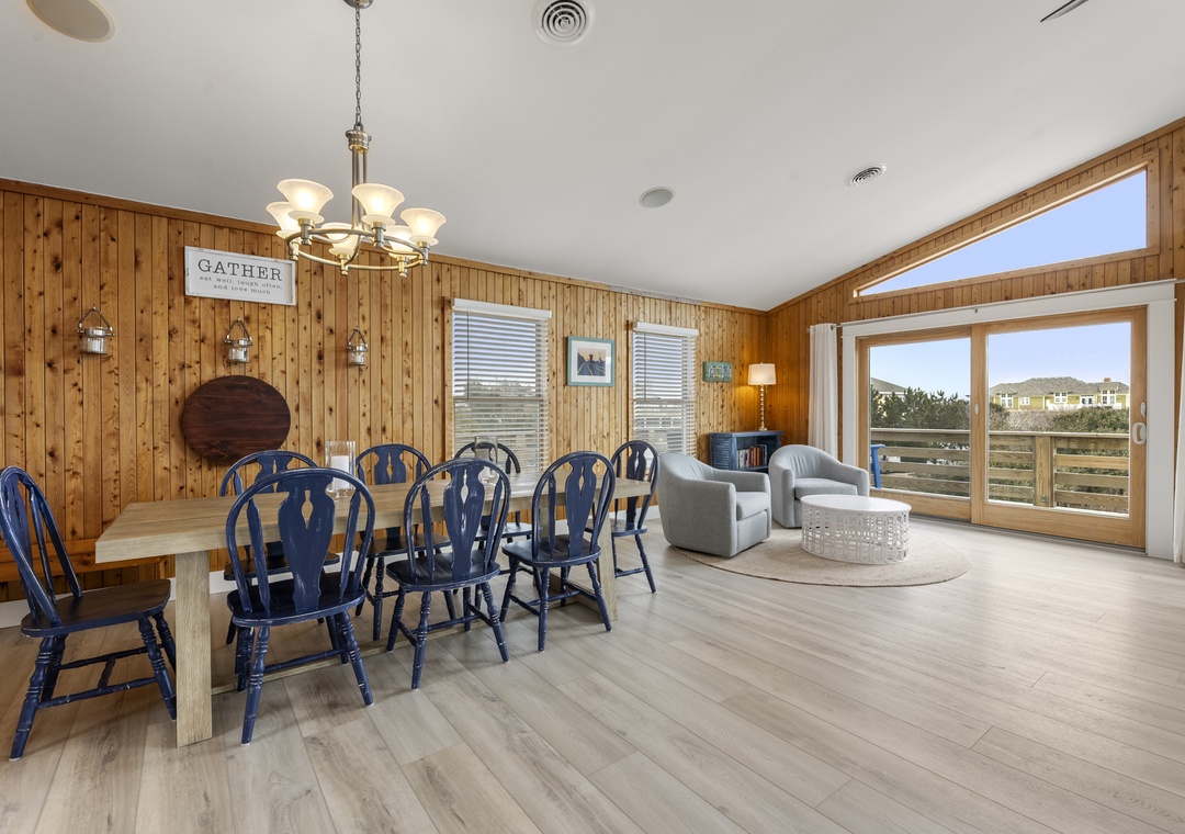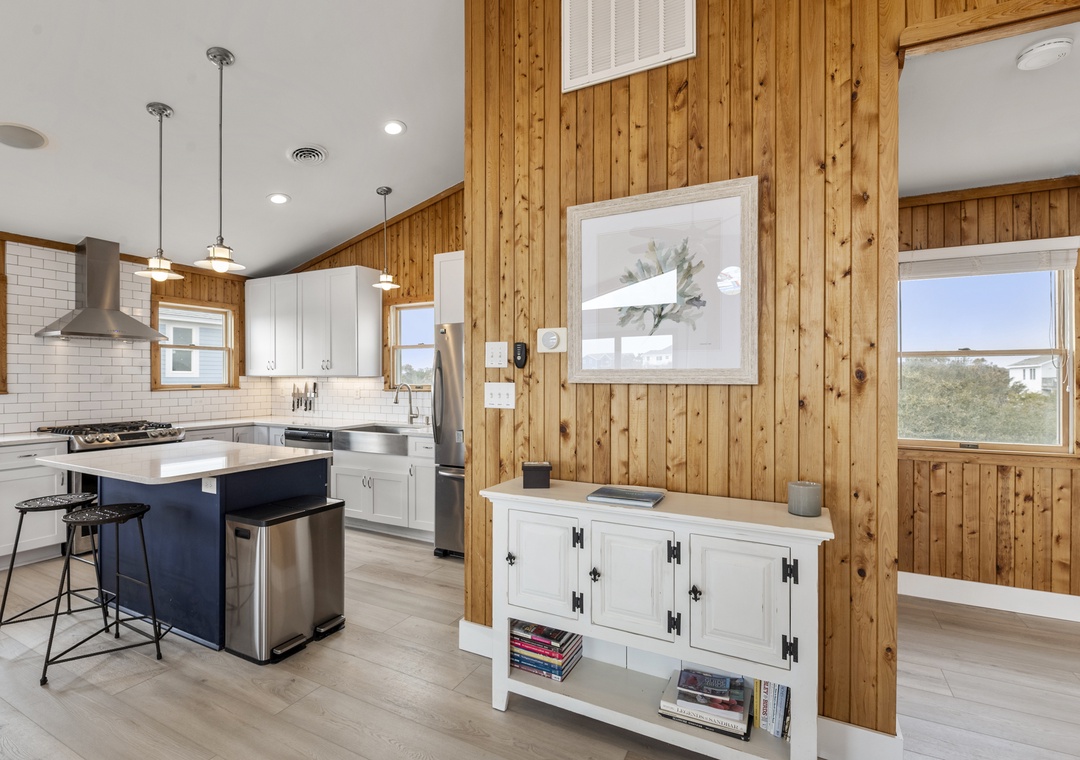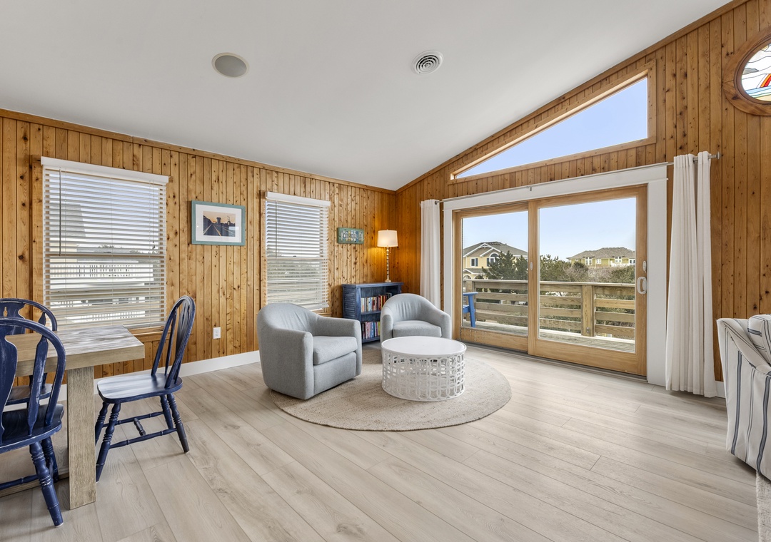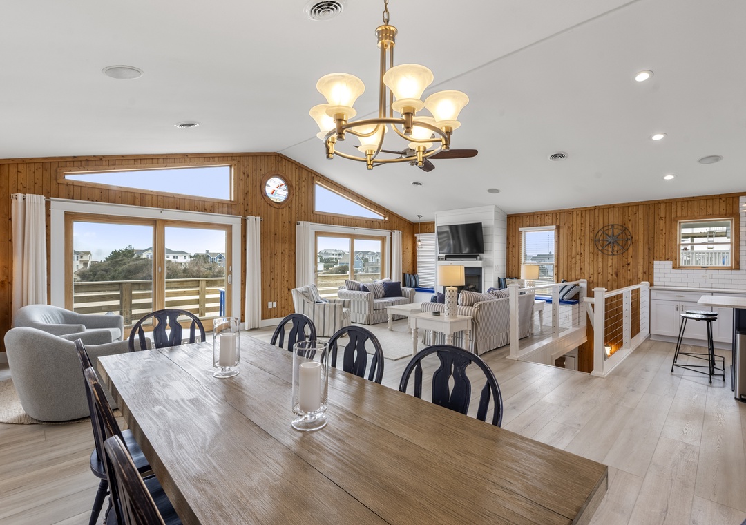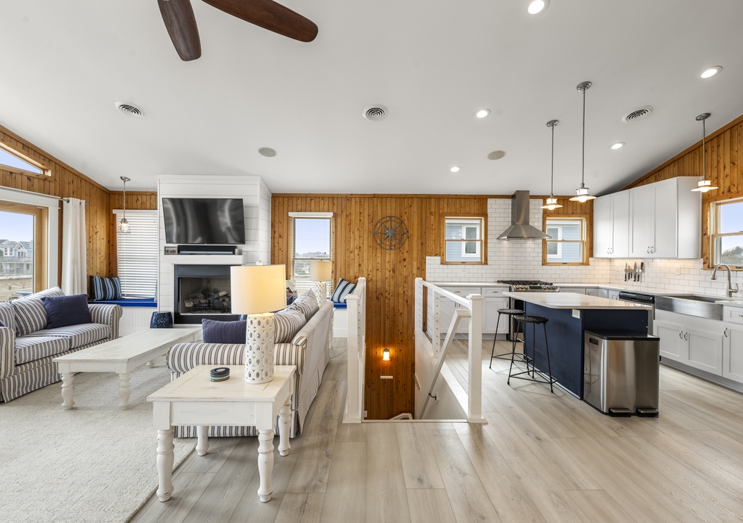 On the top level, the home opens into a bright and airy open‑concept living space that serves as the heart of the house. The living area flows seamlessly into the dining space and modern kitchen, creating an inviting setting for gathering, entertaining, and making memories together. Large windows fill the space with natural light, enhancing the fresh coastal feel. A pull‑out sofa offers additional sleeping flexibility, and a convenient half bath completes this level. With its close proximity to the beach, beautiful pool area, and open, modern interior, Whalehead 426 is an ideal choice for a relaxed and memorable Outer Banks getaway.