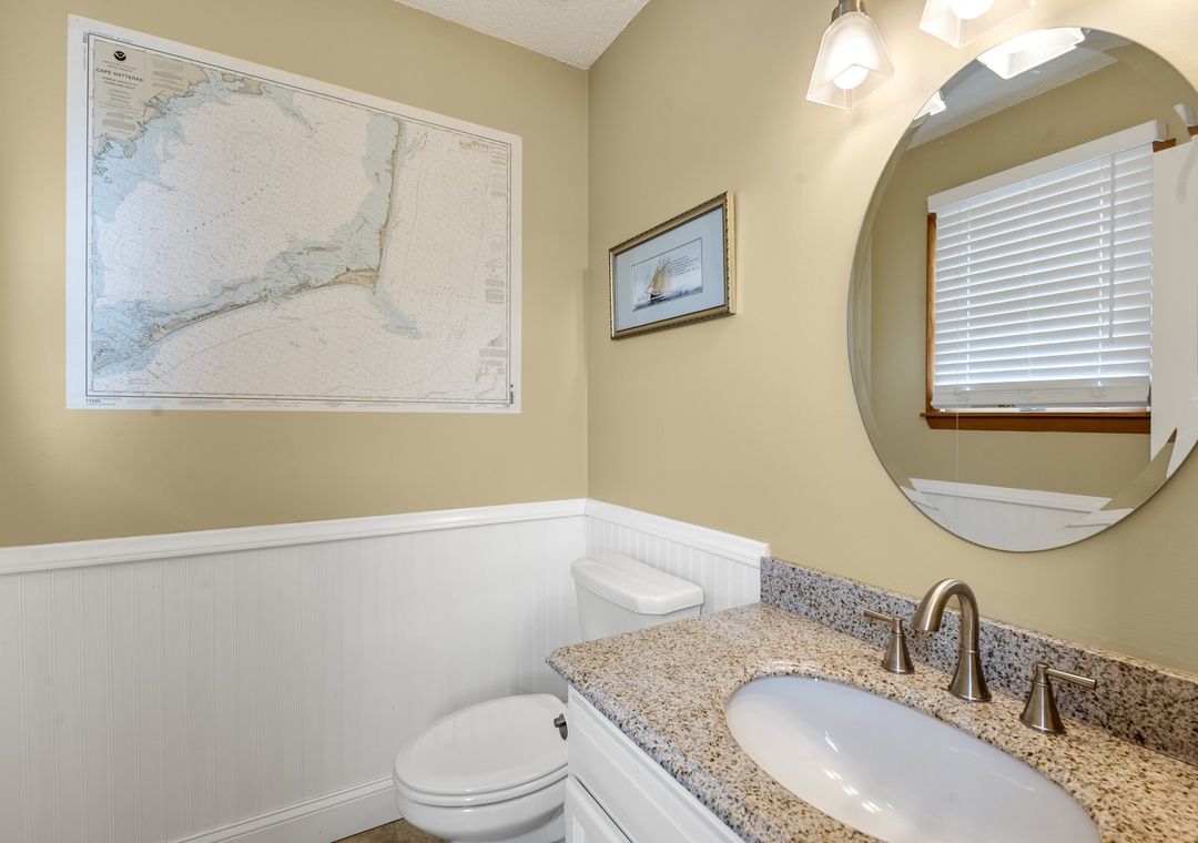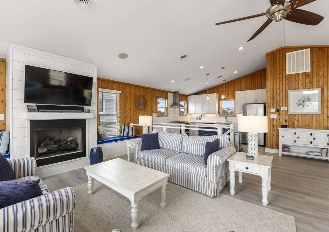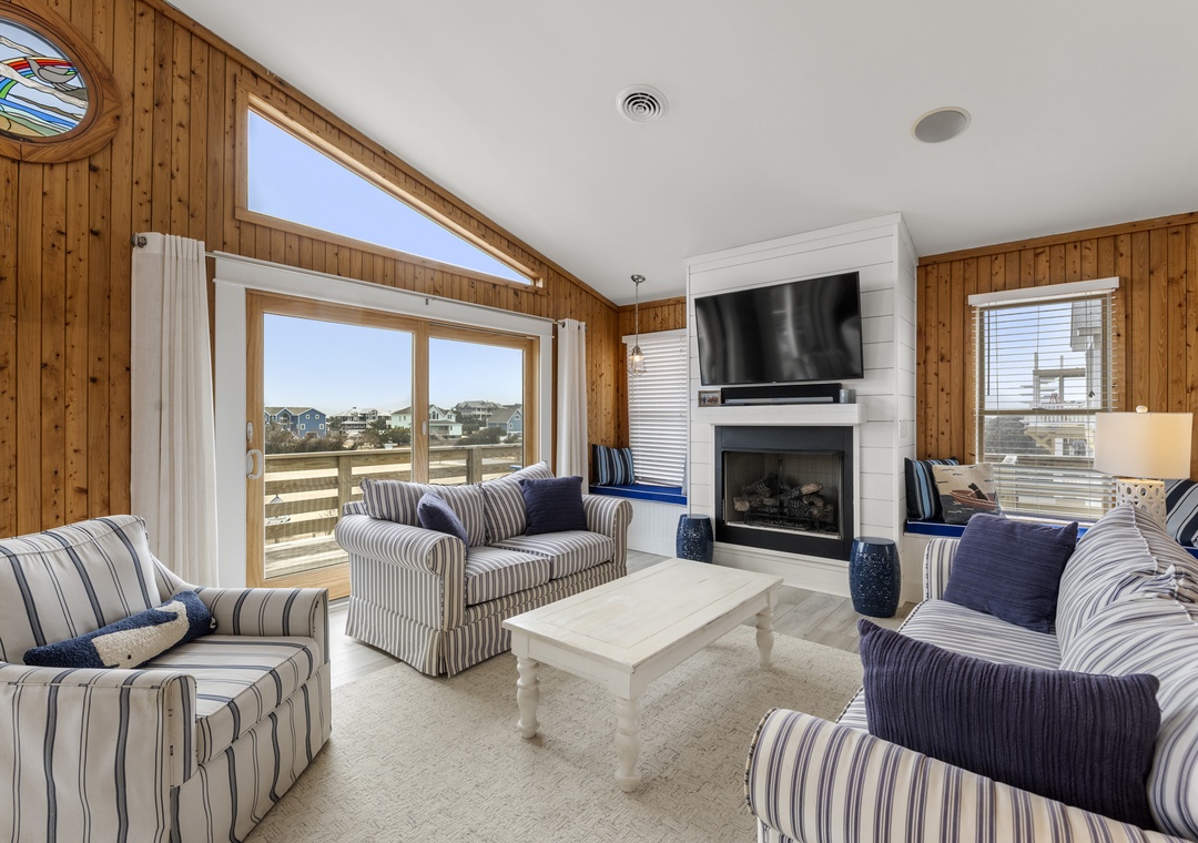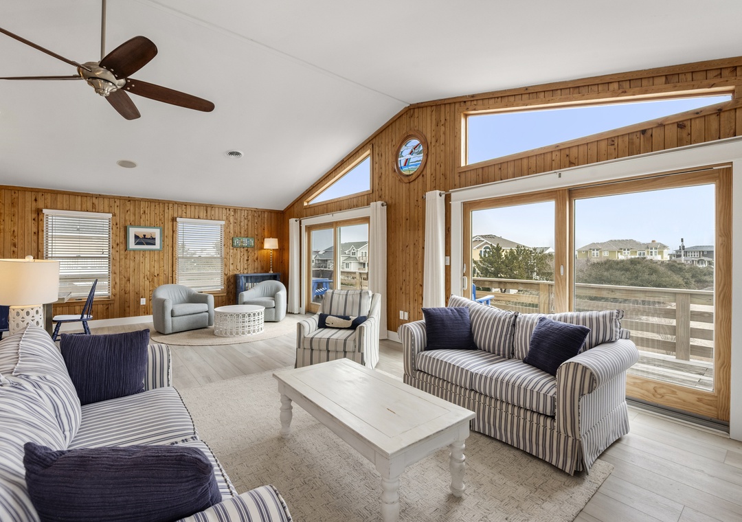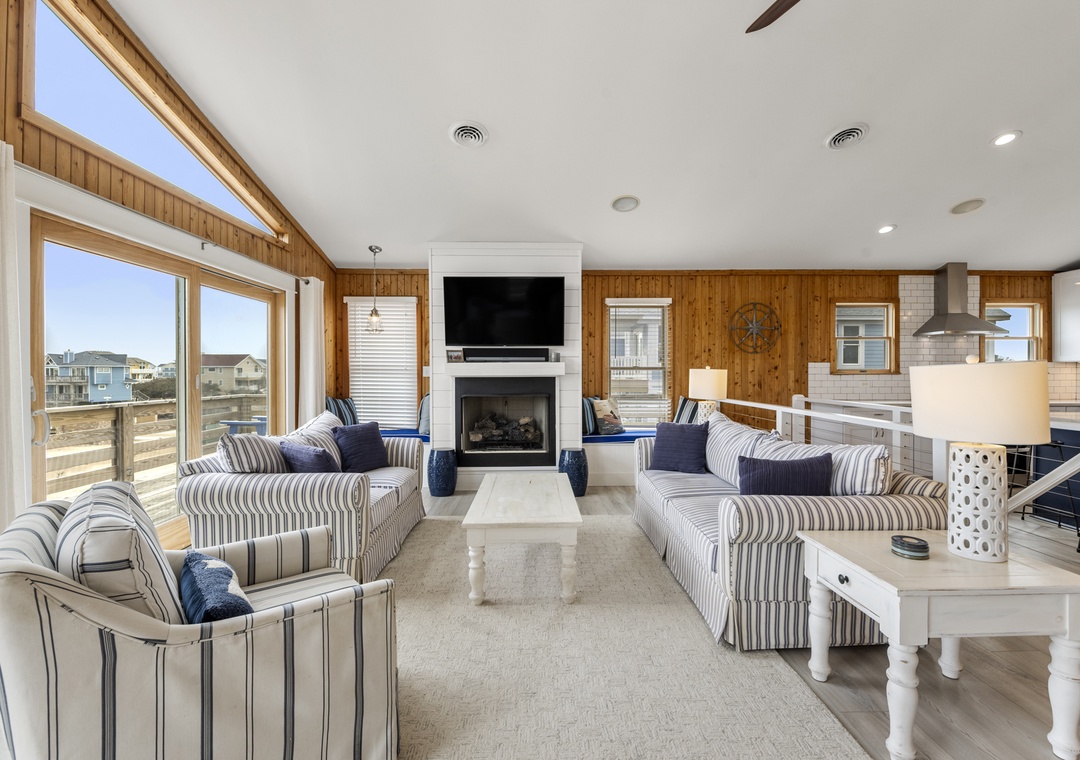 On the top level, the home opens into a bright and airy open‑concept living space that serves as the heart of the house. The living area flows seamlessly into the dining space and modern kitchen, creating an inviting setting for gathering, entertaining, and making memories together. Large windows fill the space with natural light, enhancing the fresh coastal feel. A pull‑out sofa offers additional sleeping flexibility, and a convenient half bath completes this level. With its close proximity to the beach, beautiful pool area, and open, modern interior, Whalehead 426 is an ideal choice for a relaxed and memorable Outer Banks getaway.