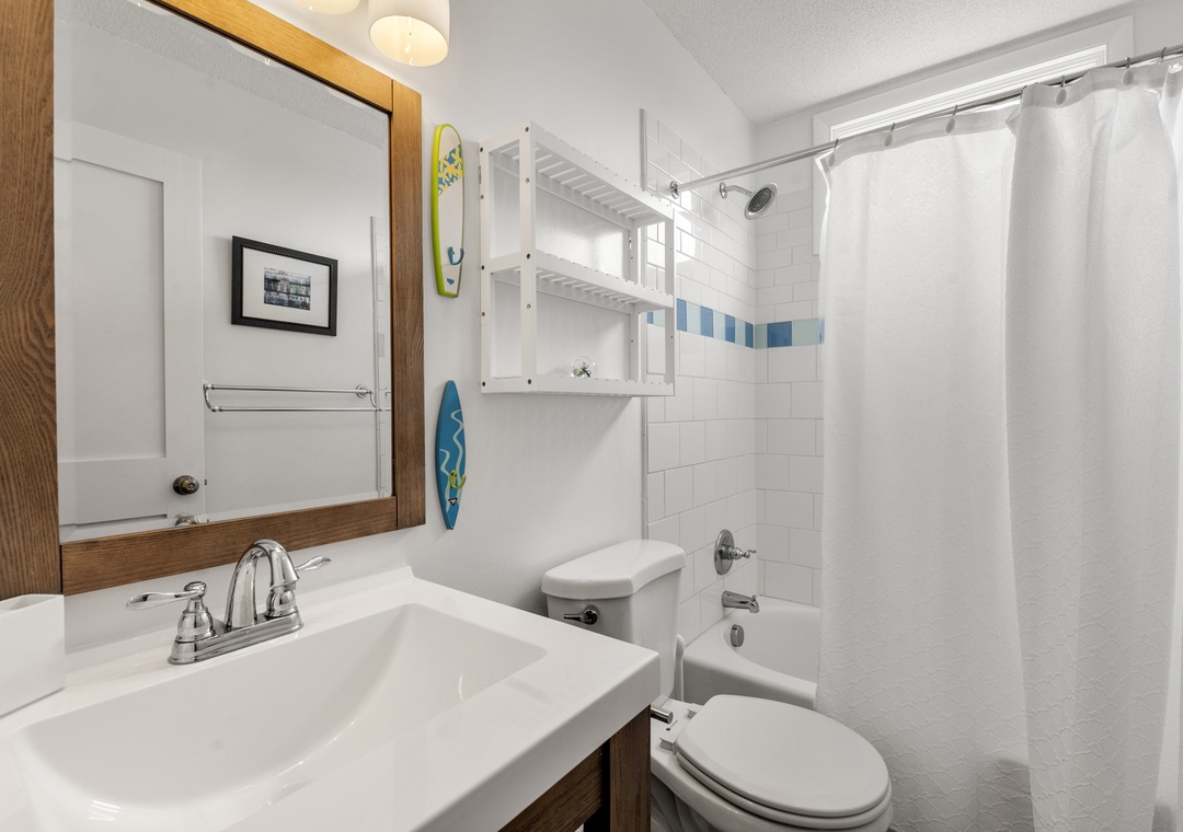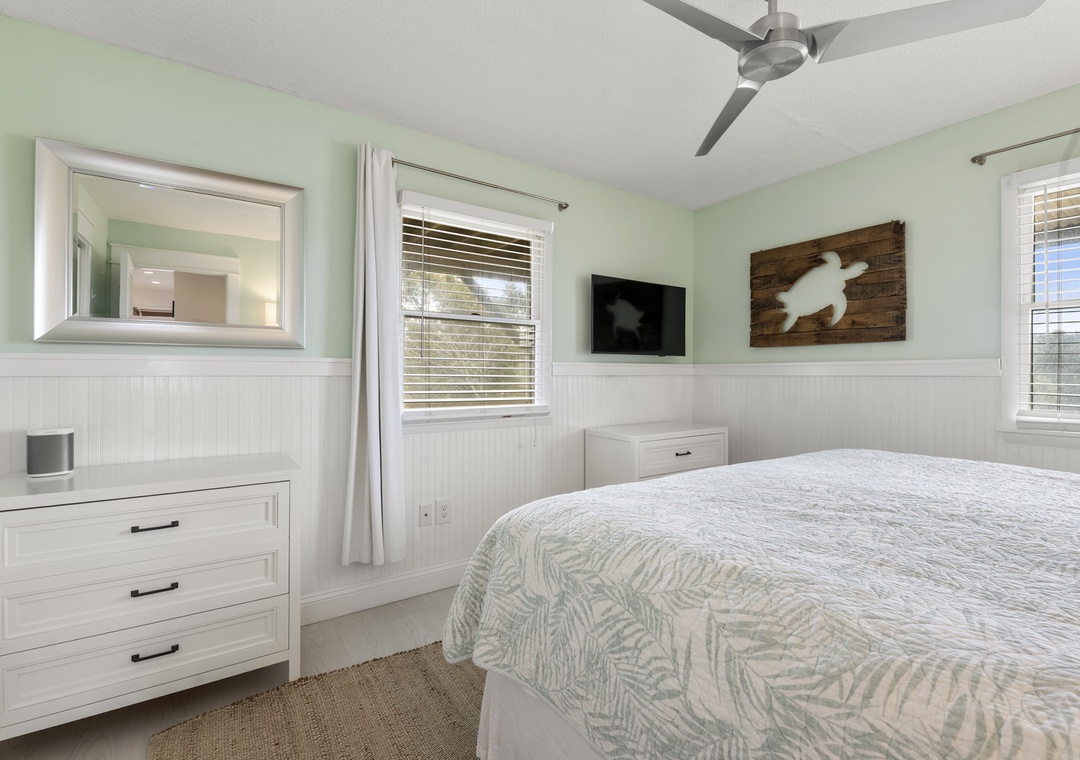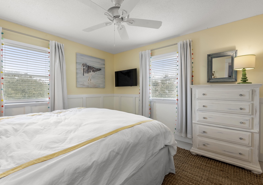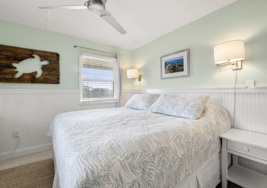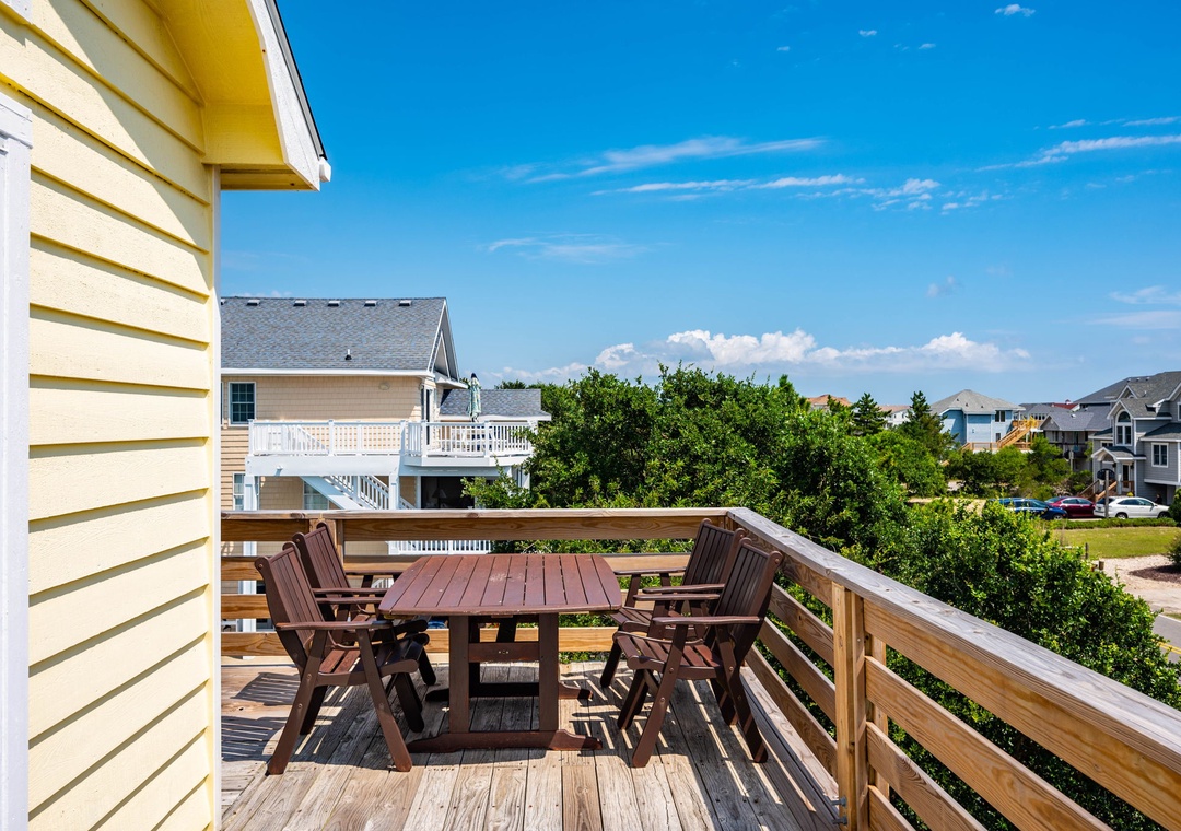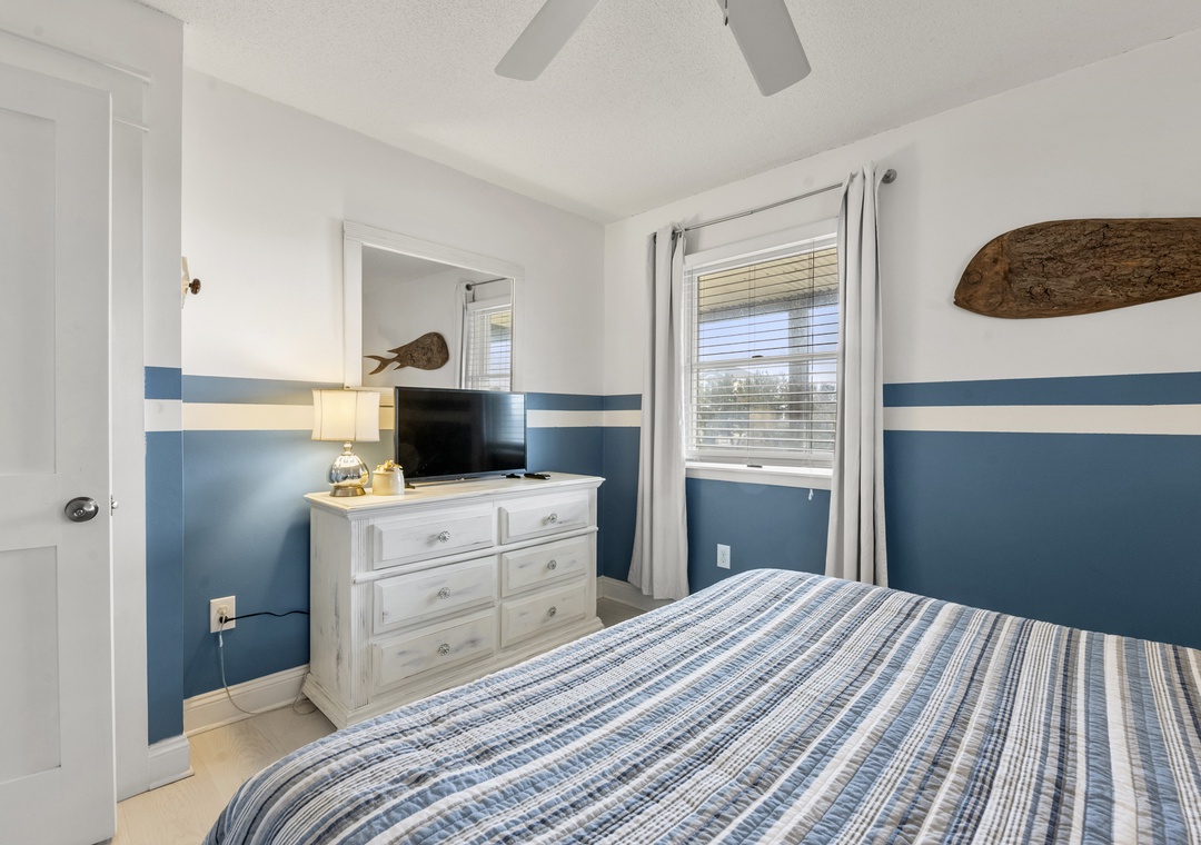 On the top level, the home opens into a bright and airy open‑concept living space that serves as the heart of the house. The living area flows seamlessly into the dining space and modern kitchen, creating an inviting setting for gathering, entertaining, and making memories together. Large windows fill the space with natural light, enhancing the fresh coastal feel. A pull‑out sofa offers additional sleeping flexibility, and a convenient half bath completes this level. With its close proximity to the beach, beautiful pool area, and open, modern interior, Whalehead 426 is an ideal choice for a relaxed and memorable Outer Banks getaway.