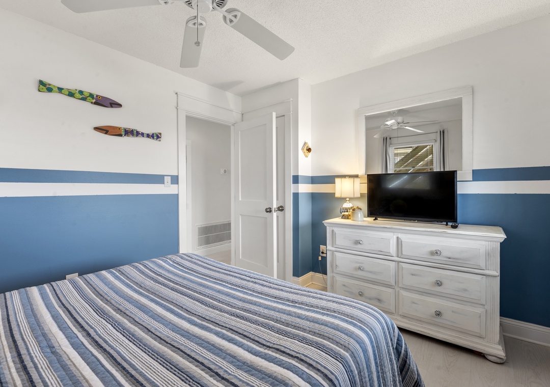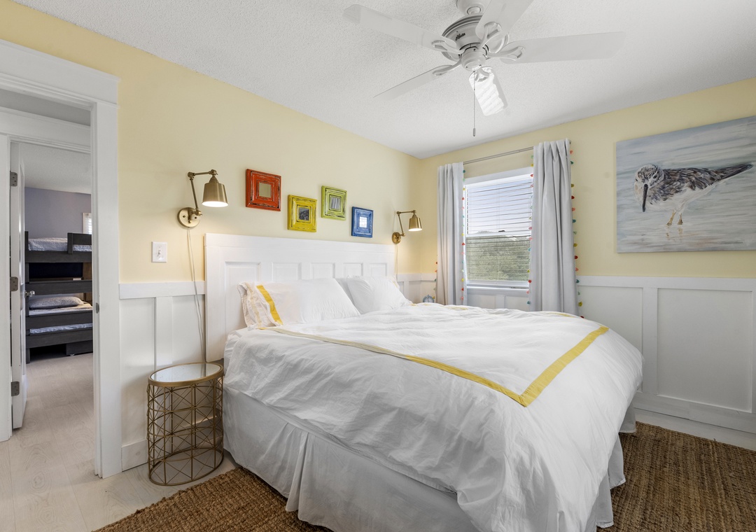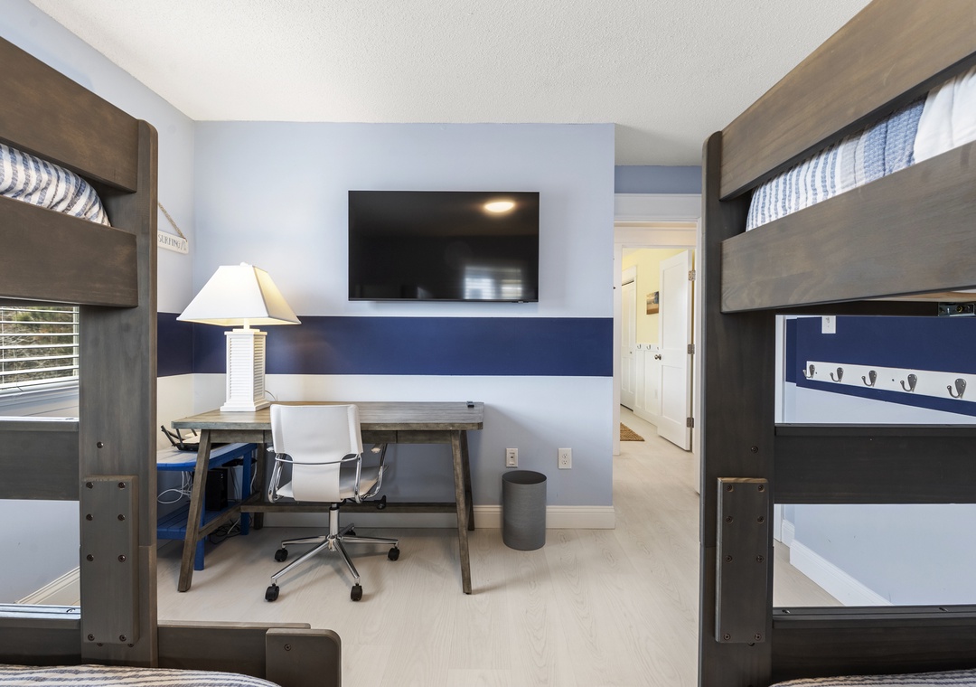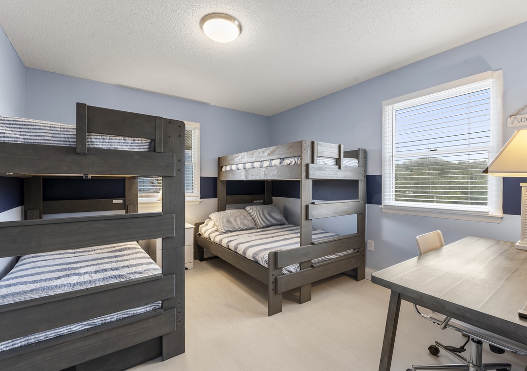 The middle level is dedicated to comfortable and versatile sleeping accommodations. This floor features two spacious king bedrooms and a cozy queen bedroom, along with an additional bedroom designed for younger guests or extra family members, offering a twin‑over‑twin bunk paired with a twin‑over‑full bunk. A large desk area provides a convenient workspace or homework spot, while two full bathrooms on this level ensure everyone has space to get ready with ease.