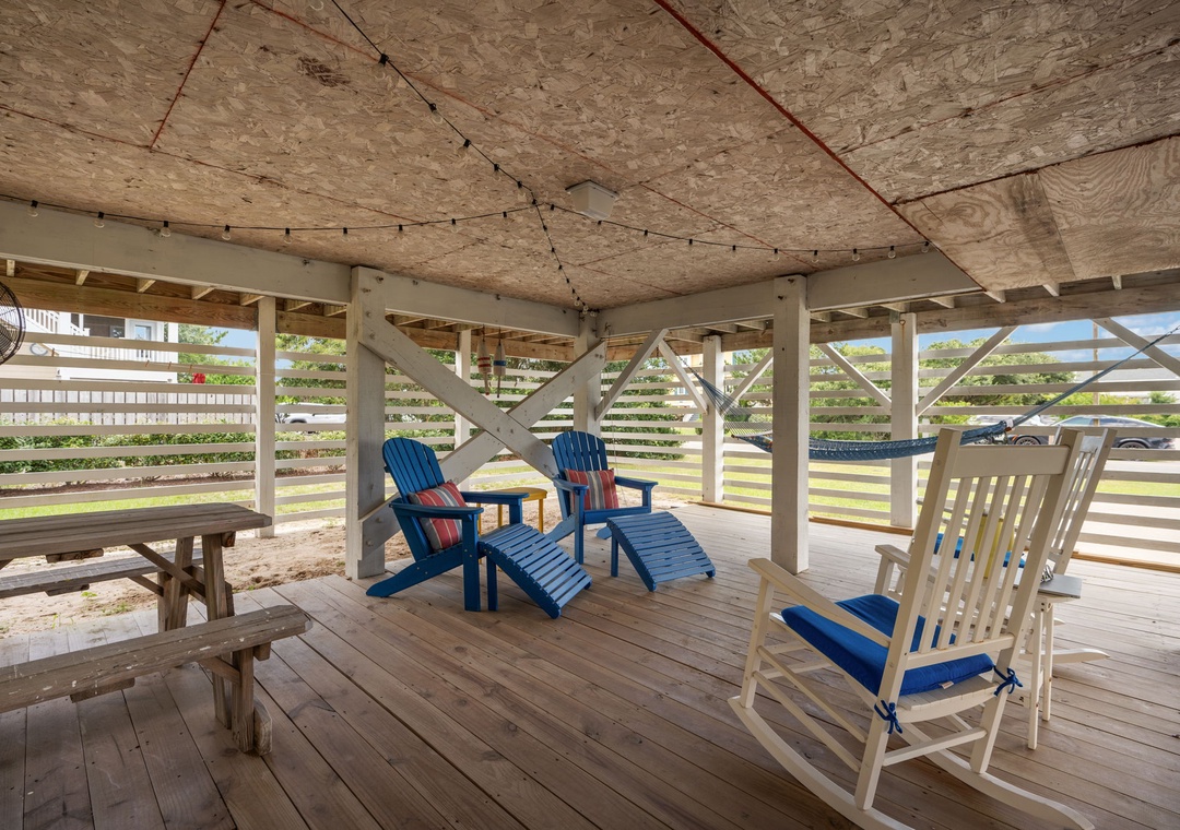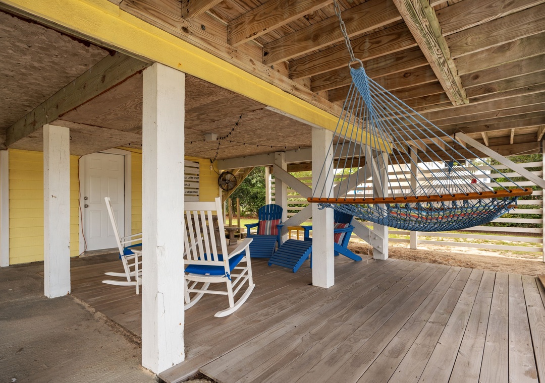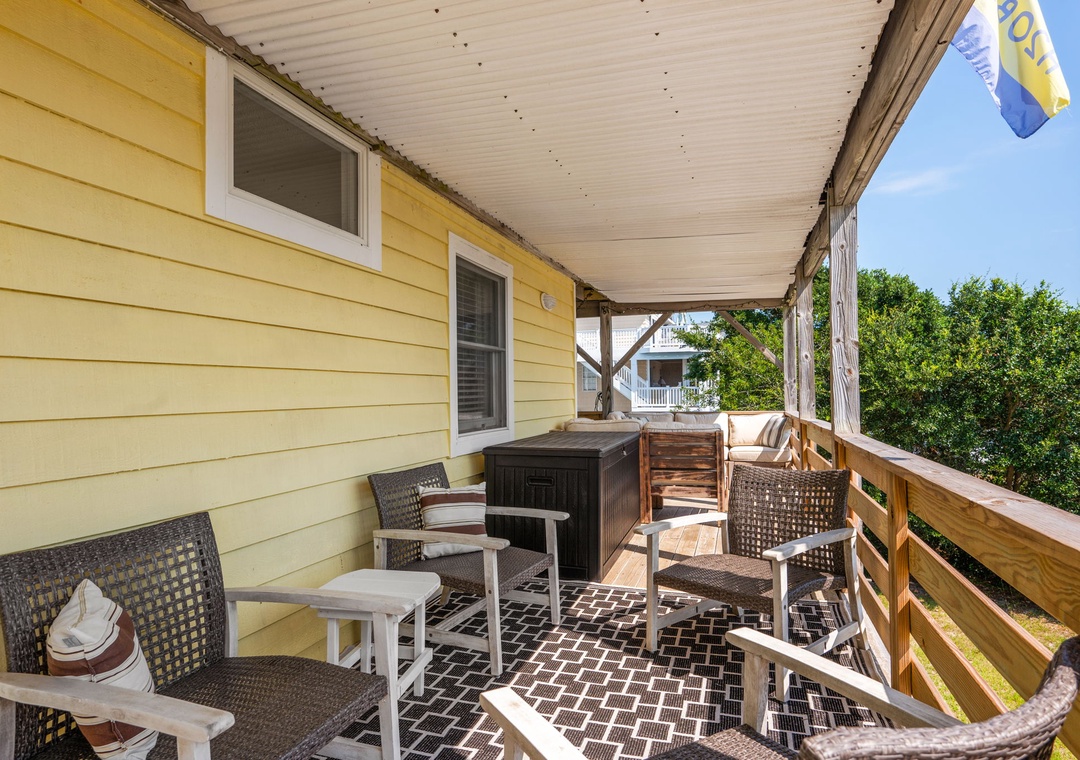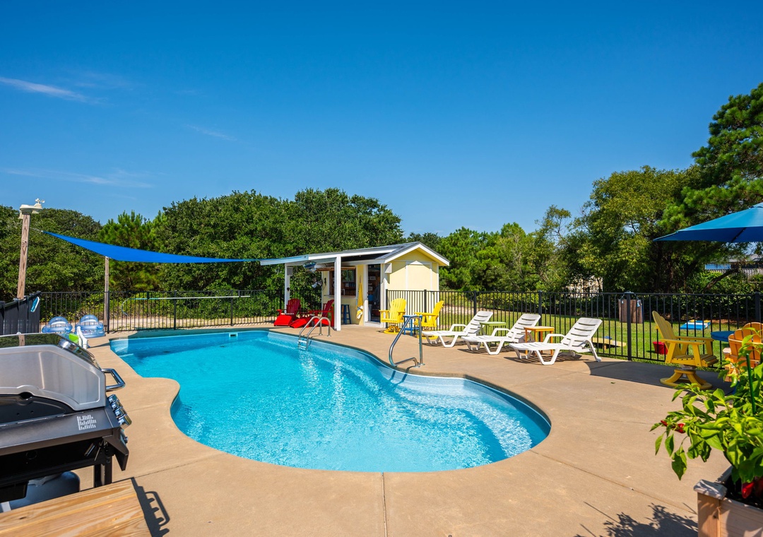 Upon arrival you’ll find a welcoming outdoor space designed for relaxation and fun, featuring a covered patio with comfortable seating that opens to a great private pool area. The pool includes sun‑shaded areas for cooling off on warm summer days and a tiki bar that makes it easy to enjoy drinks and conversation after a day in the sand and surf.