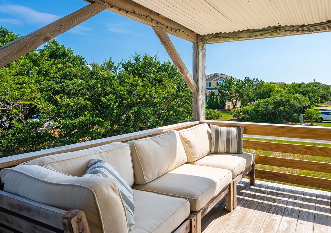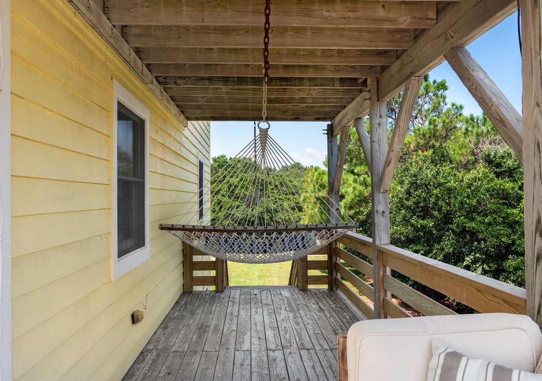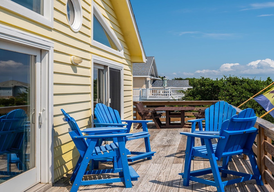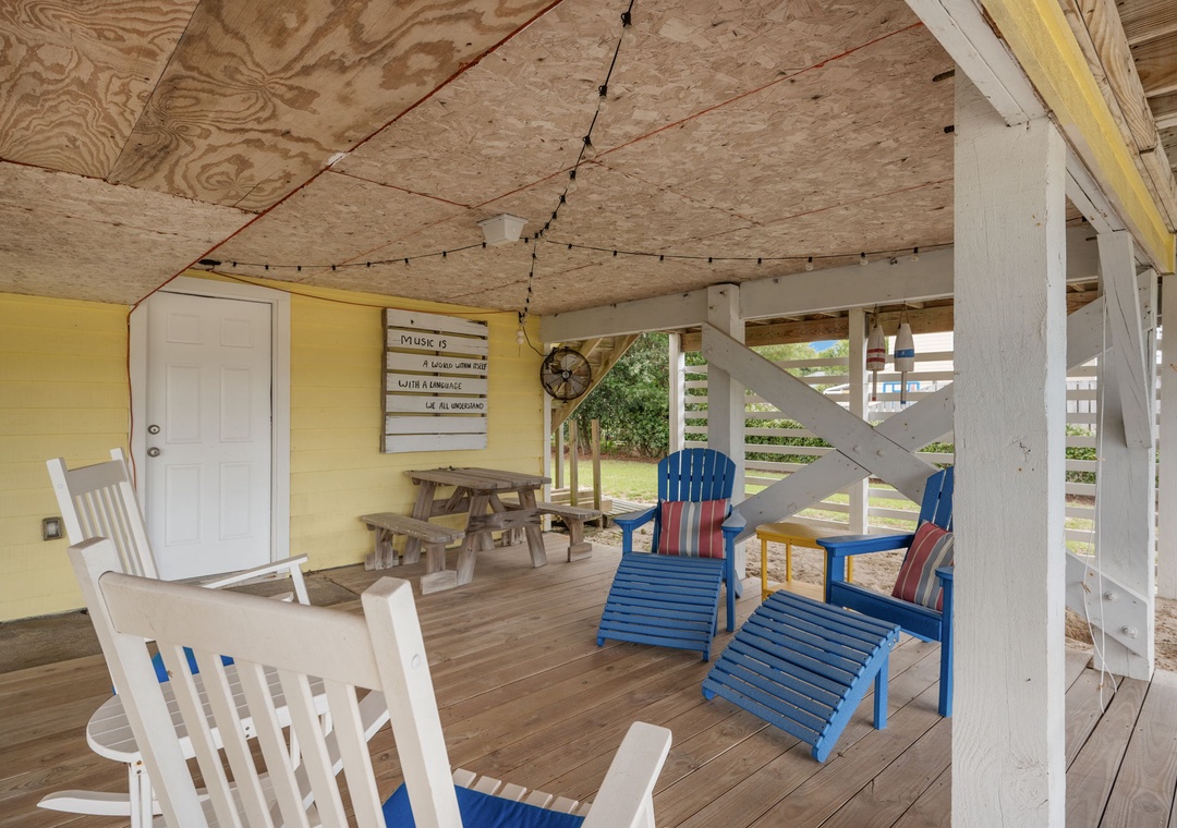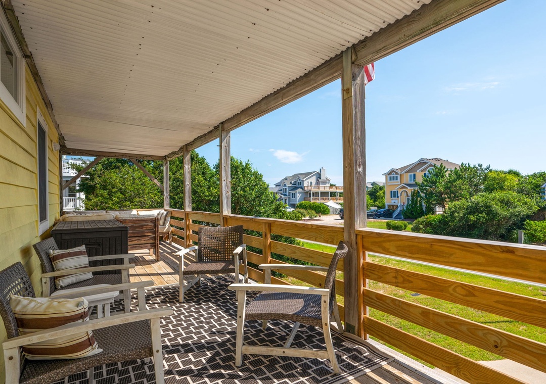 Upon arrival you’ll find a welcoming outdoor space designed for relaxation and fun, featuring a covered patio with comfortable seating that opens to a great private pool area. The pool includes sun‑shaded areas for cooling off on warm summer days and a tiki bar that makes it easy to enjoy drinks and conversation after a day in the sand and surf.