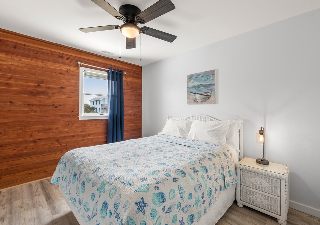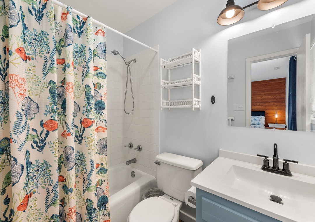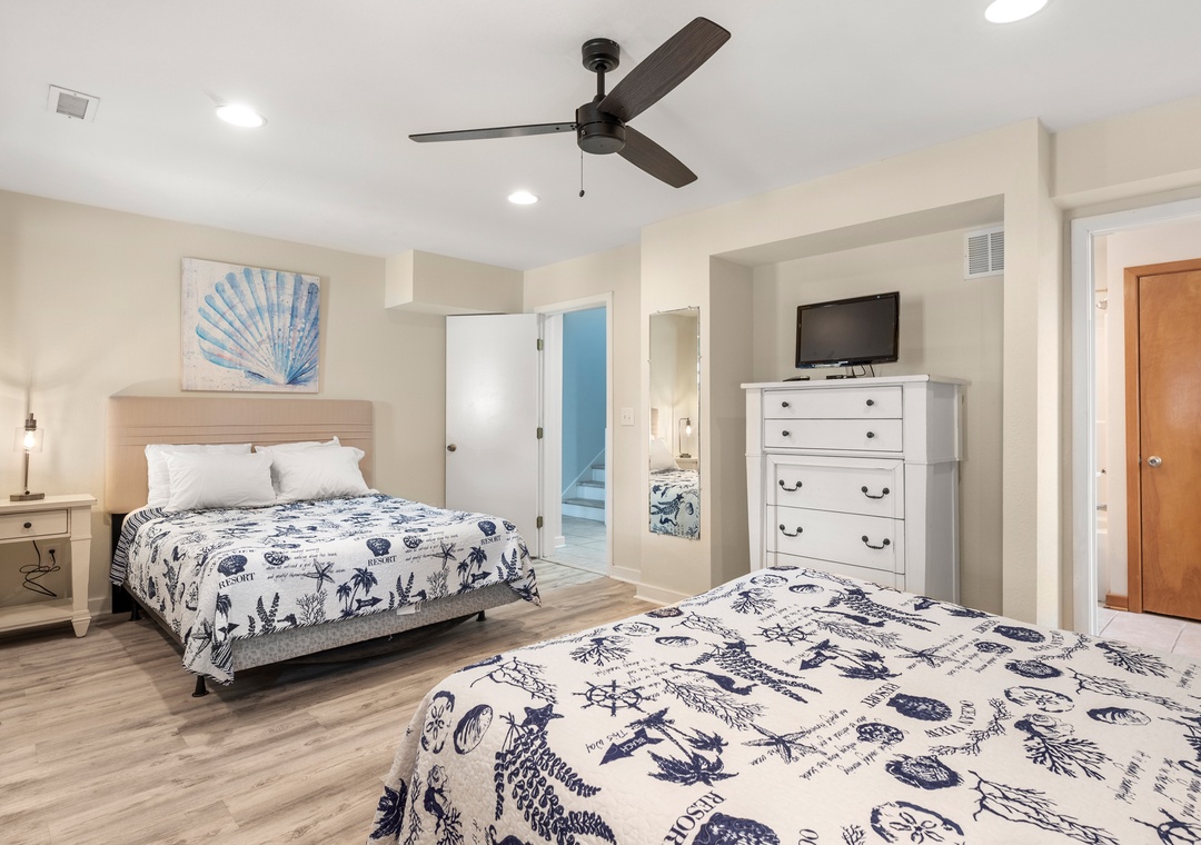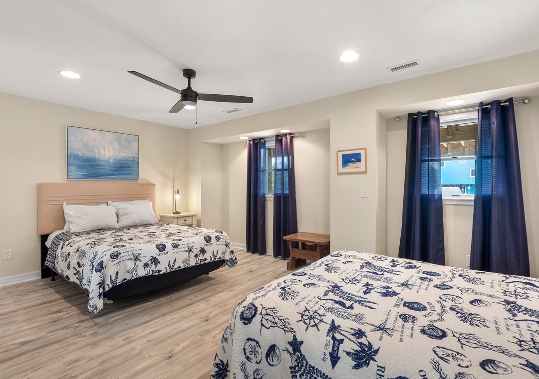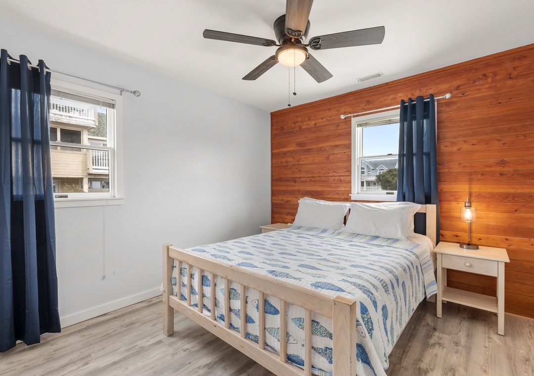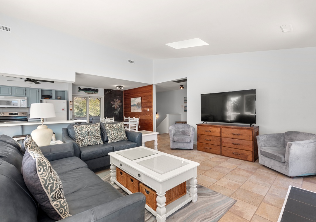 Wishing Whale is ideal for extended families or multiple groups vacationing together. The primary suite is located on the top level along with two additional bedrooms that share a full hall bath. Downstairs, you'll find a second ensuite as well as a bonus room for alternative sleeping arrangements. The den on the ground level serves as a second living area. The den on the ground level serves as a second living area, with convenient access to a kitchenette with full-size fridge, microwave and coffee maker.