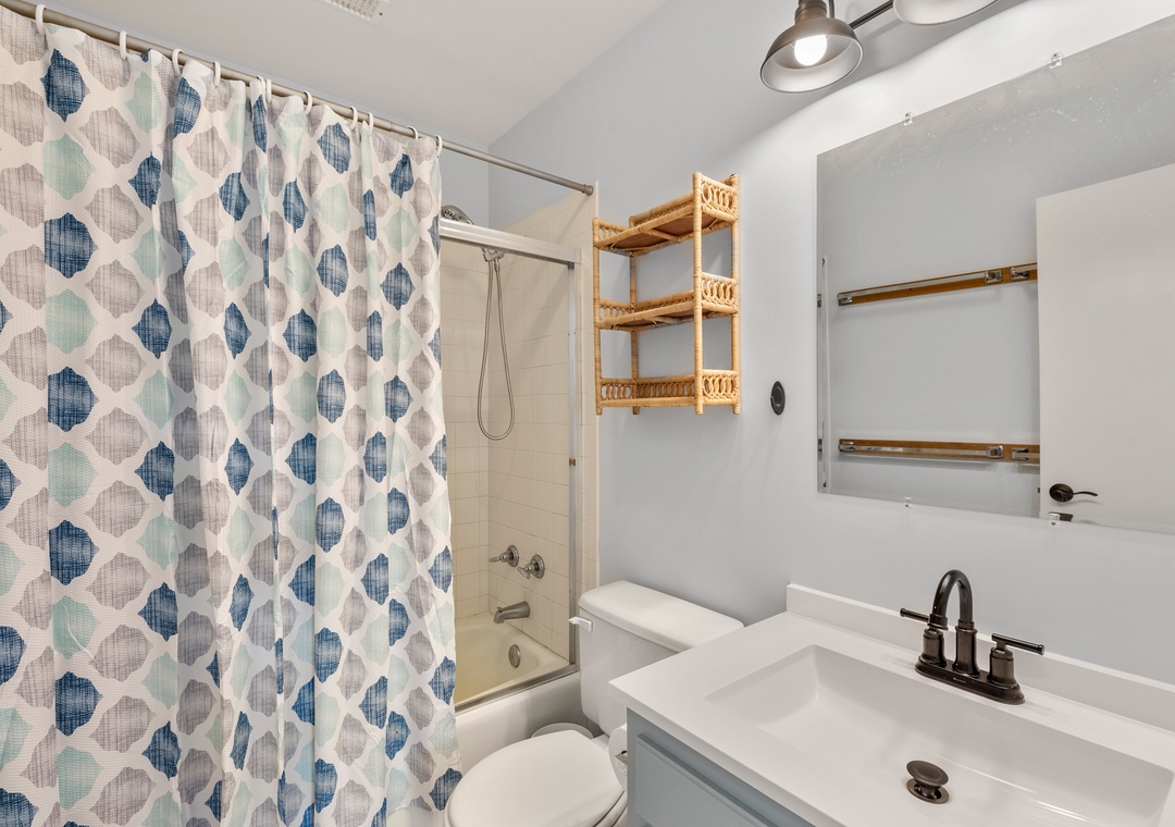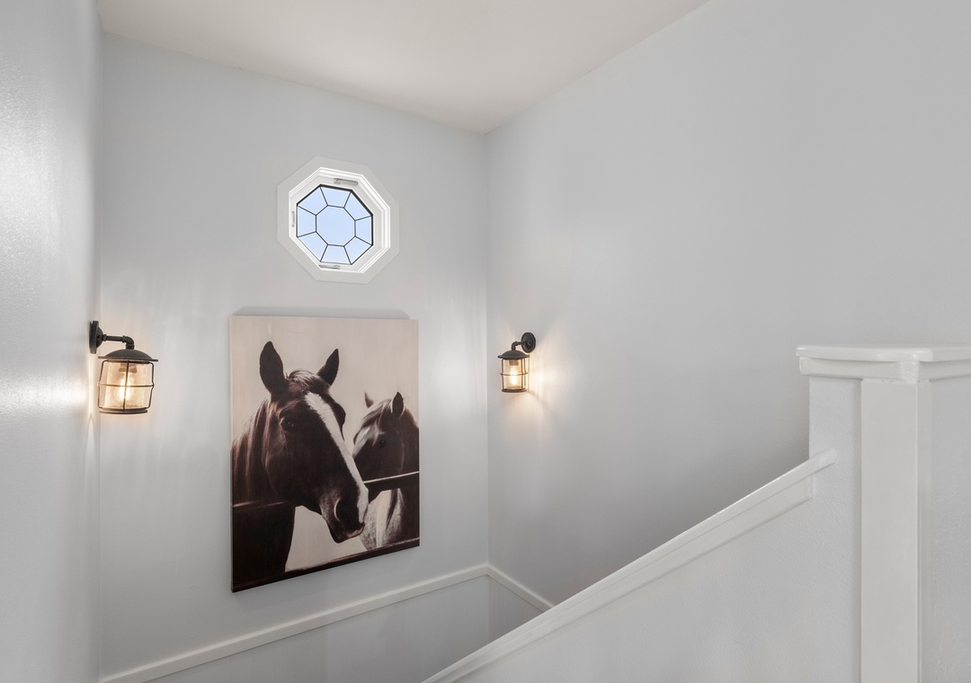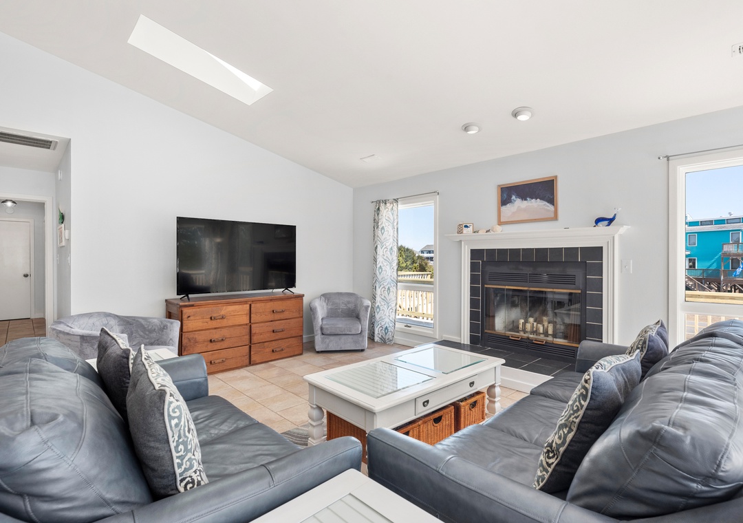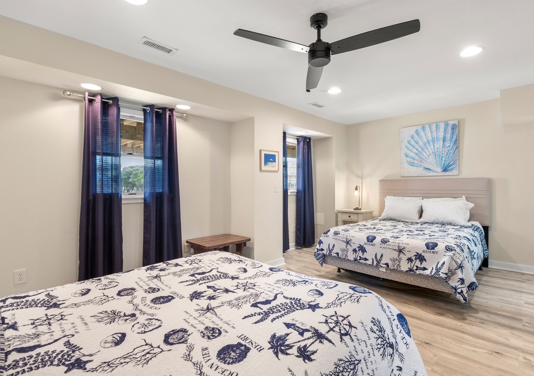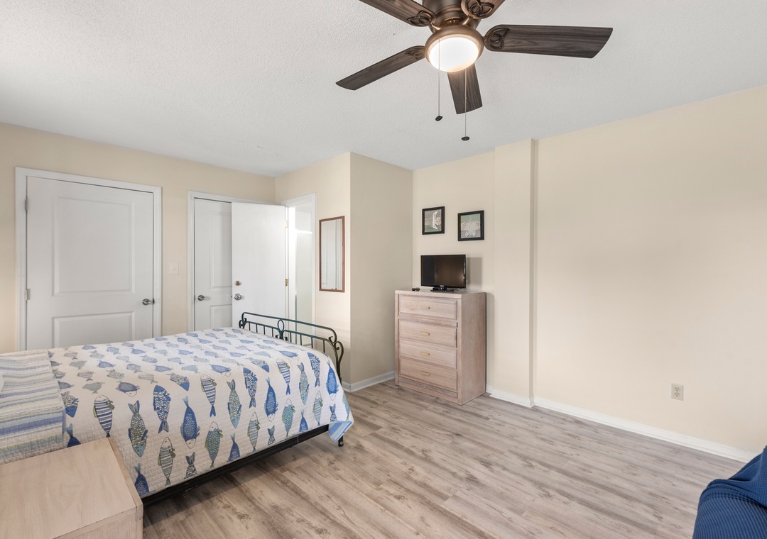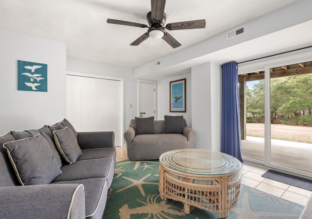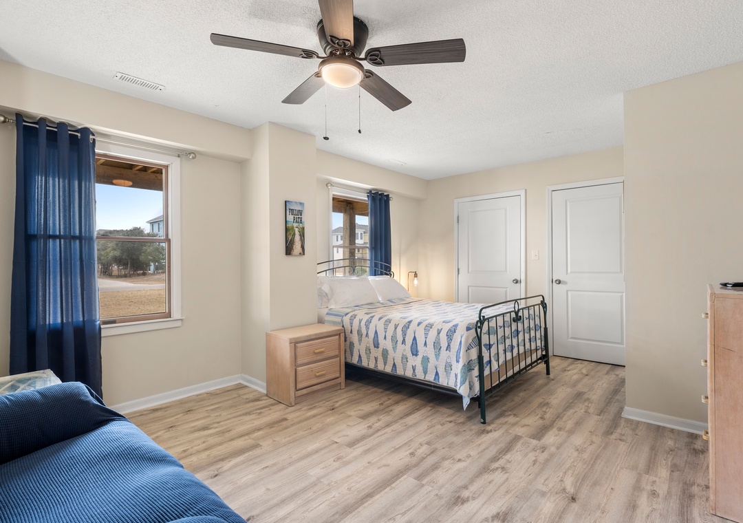 Wishing Whale is ideal for extended families or multiple groups vacationing together. The primary suite is located on the top level along with two additional bedrooms that share a full hall bath. Downstairs, you'll find a second ensuite as well as a bonus room for alternative sleeping arrangements. The den on the ground level serves as a second living area. The den on the ground level serves as a second living area, with convenient access to a kitchenette with full-size fridge, microwave and coffee maker.