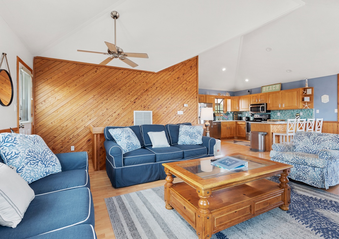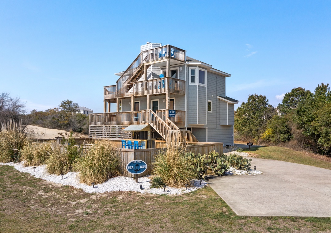 Just returned from a week at Sea Blue! My husband and I took 6 teenagers, and the house was perfectly comfortable and accommodating. Great central gathering space on the top floor, we ordered a seafood broil and had plenty of seating for all. The location is 5 minutes to beach or 5 minutes to convenience such as grocery store, ice cream, brewery, restaurants, etc. We ended up returning the golf cart rental since you can’t park your cart at the beach, and everything is quite walkable, there was no real need. The house has extra beach chairs, beach wagon, and floats (FYI). We left behind beach kick ball for the next family to enjoy. Only warning would be to ensure your kids wear flip flops when walking on the decks because there are nails sticking up. Also the grill is charcoal only. SO many steps, be ready to climb to unload your luggage and groceries. Would definitely stay again, loved it!- Reviewed On: 7/5/2024