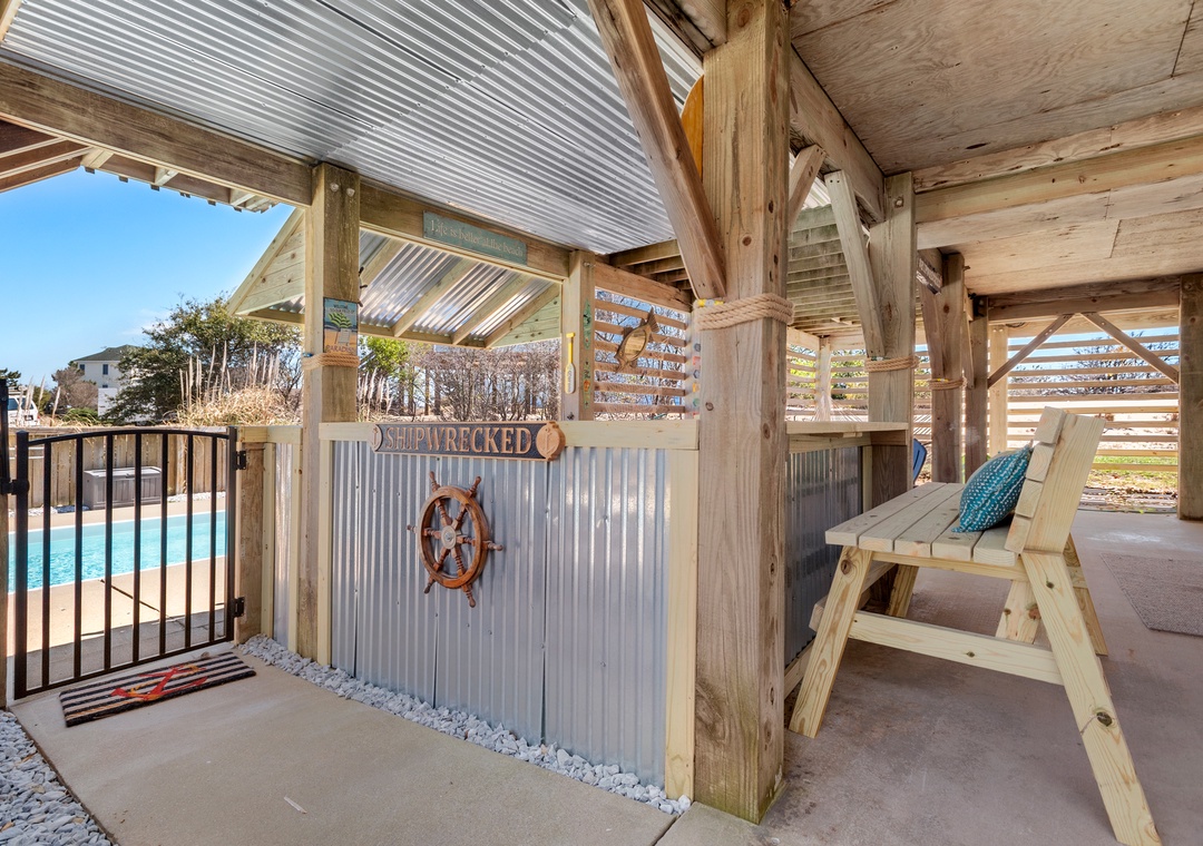 The outdoor shower is around back, away from the pool!- Reviewed On: 6/7/2024