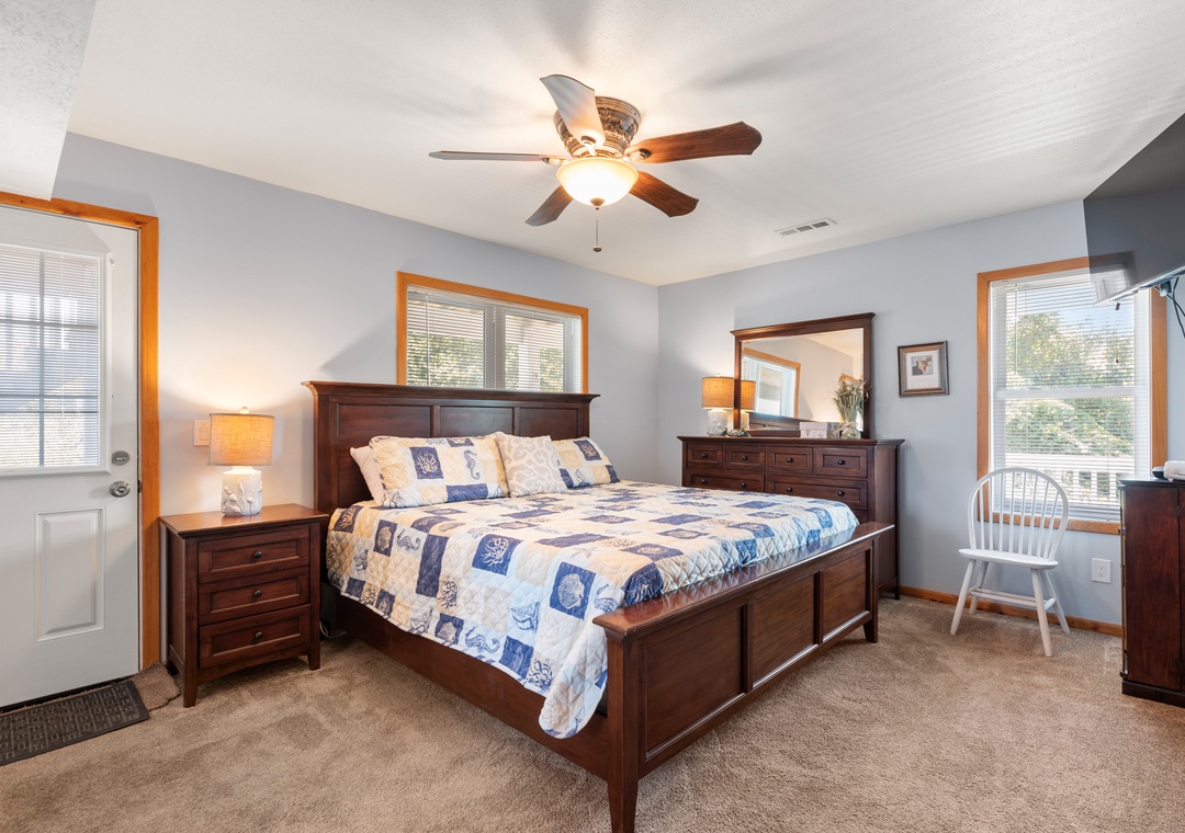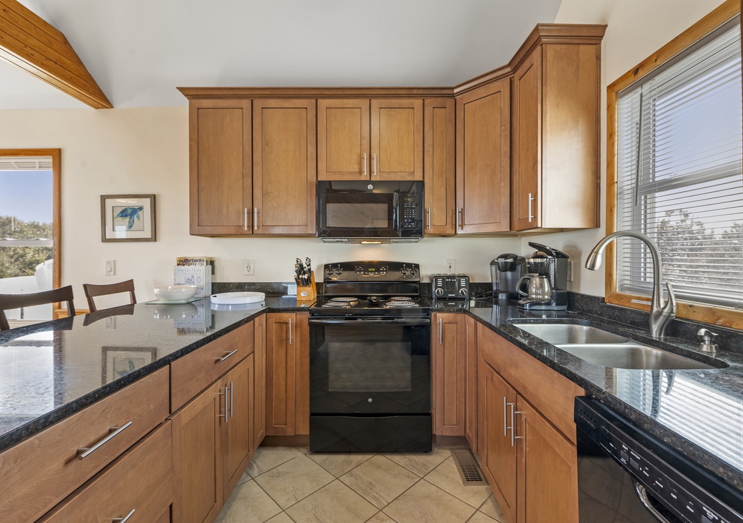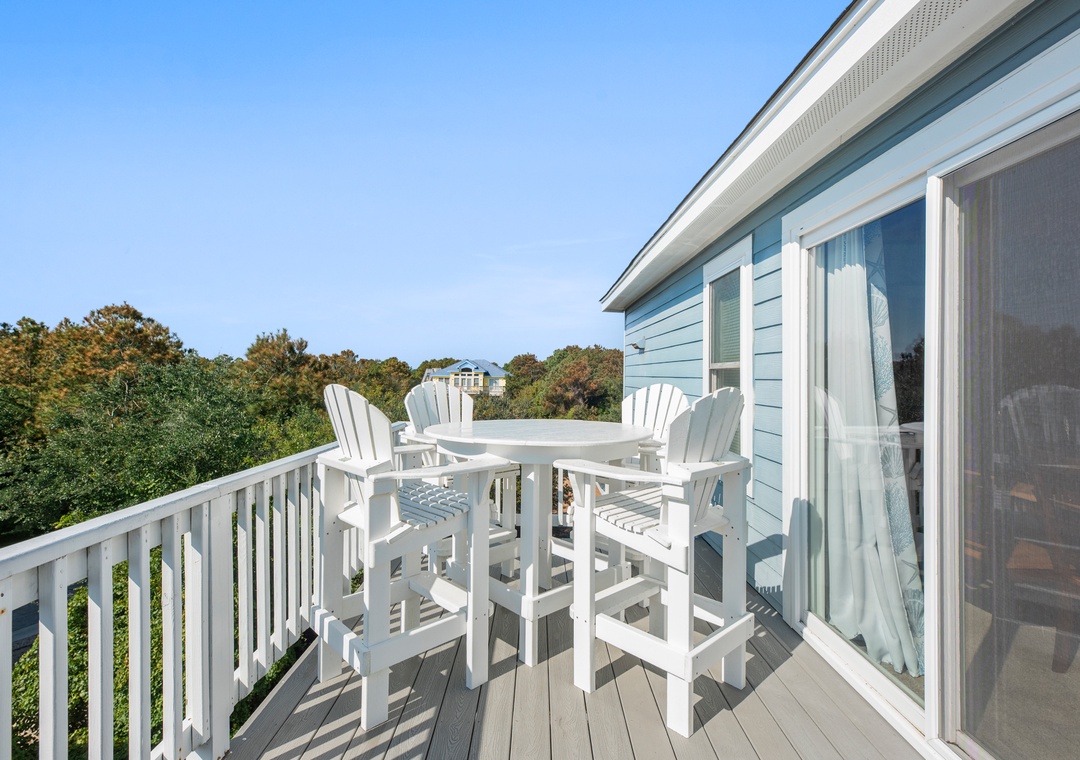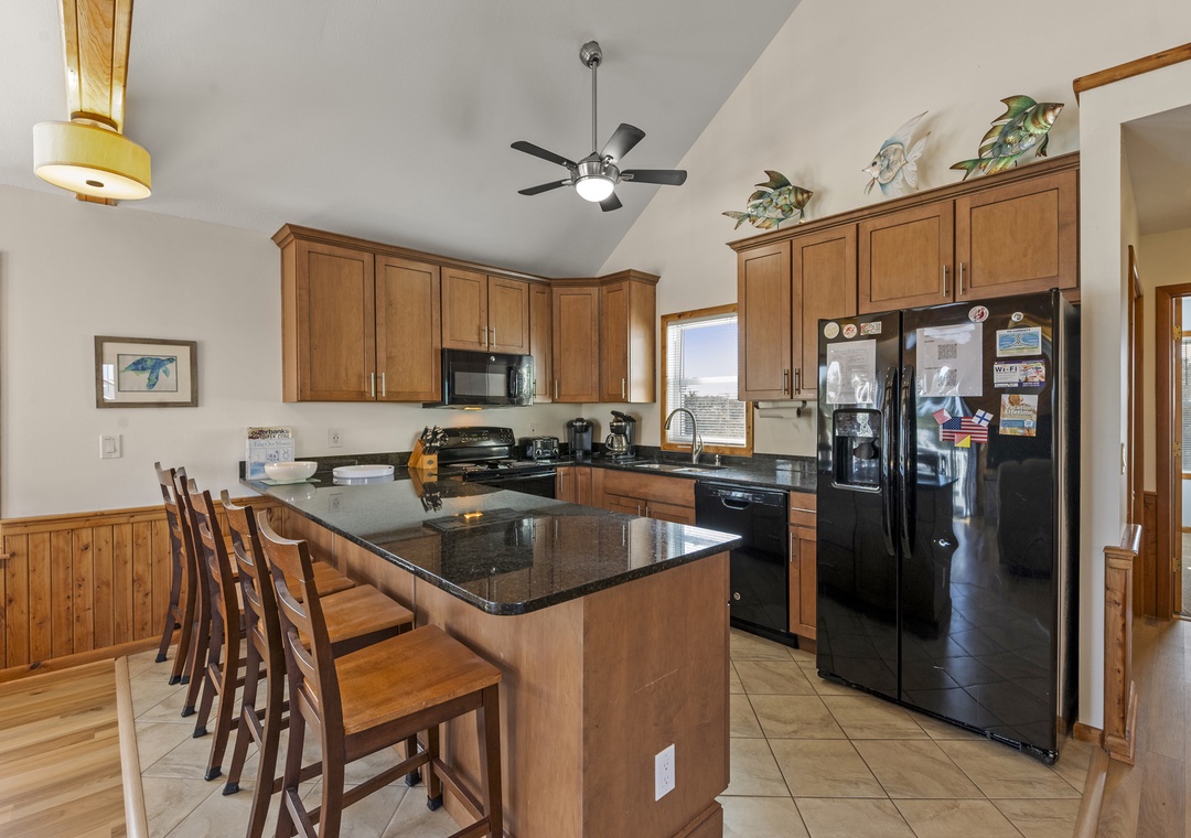 Upstairs, the open living area invites you to relax with a 50-inch flat-screen TV and DVD player or step out onto the top deck to soak in the hot tub under the stars. The fully equipped kitchen features granite countertops, an island with seating for four, and everything you need to prepare meals at home. With a dining table that seats eight, a half bath, and a cozy sunroom with a bistro set, this level is designed for gathering and making lasting memories. A queen bedroom completes the upper floor, offering a peaceful retreat after a day of fun.