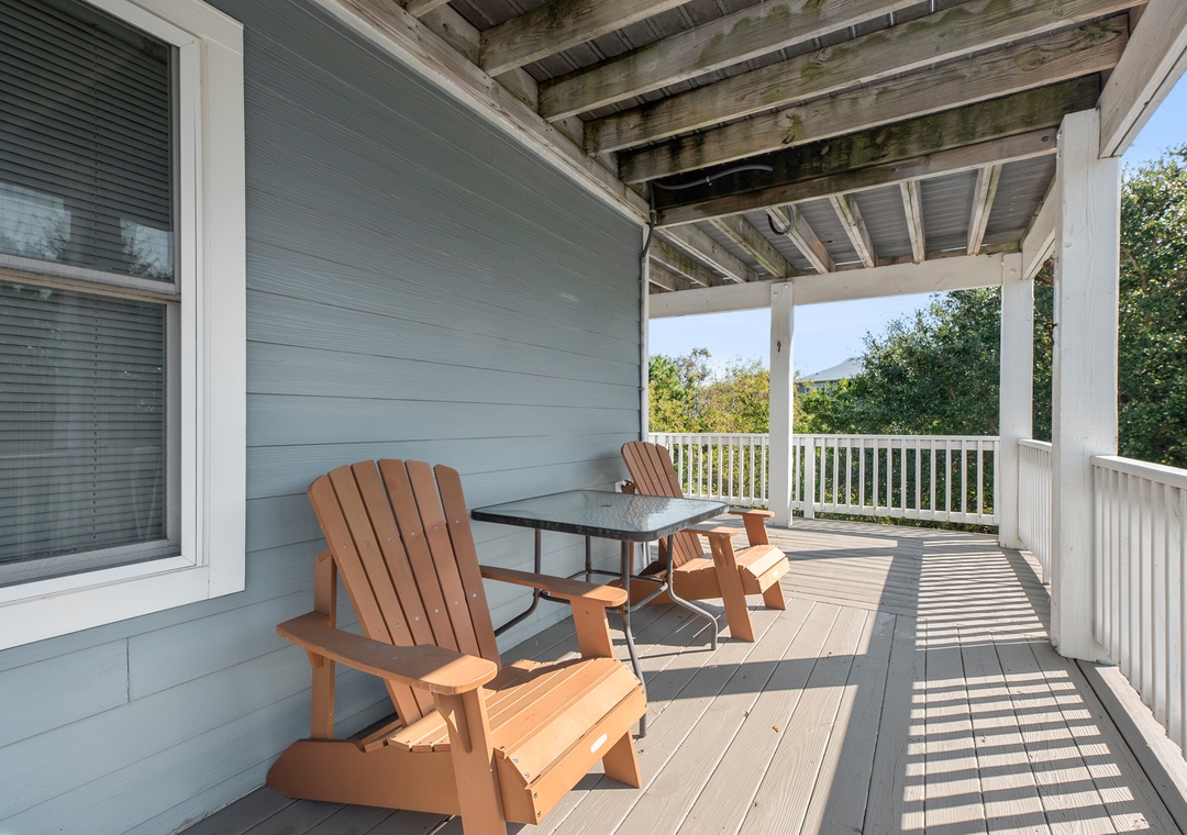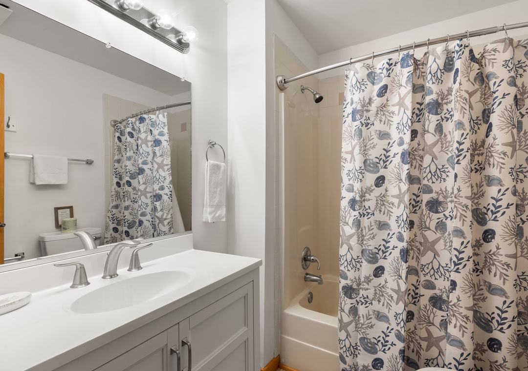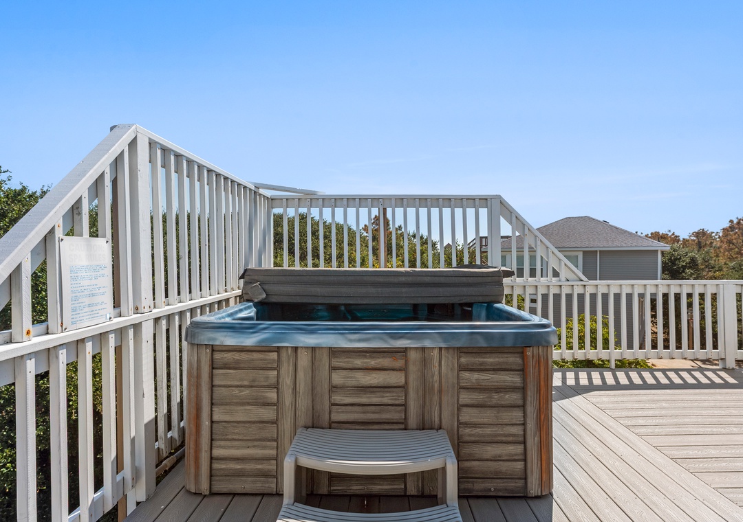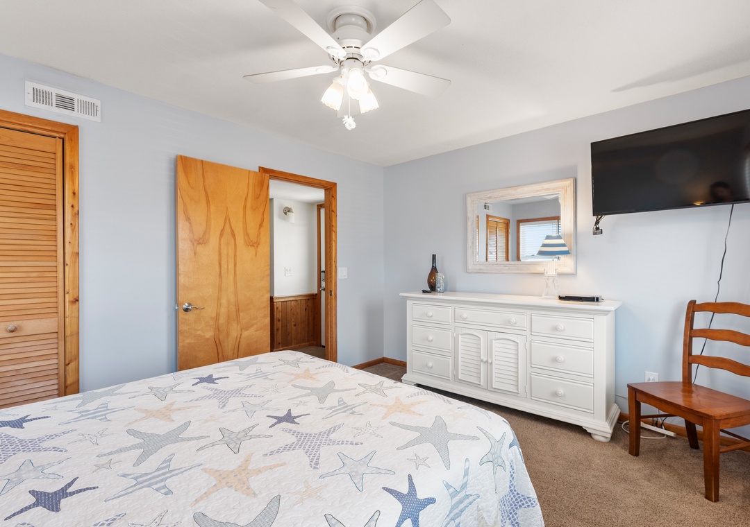 Upstairs, the open living area invites you to relax with a 50-inch flat-screen TV and DVD player or step out onto the top deck to soak in the hot tub under the stars. The fully equipped kitchen features granite countertops, an island with seating for four, and everything you need to prepare meals at home. With a dining table that seats eight, a half bath, and a cozy sunroom with a bistro set, this level is designed for gathering and making lasting memories. A queen bedroom completes the upper floor, offering a peaceful retreat after a day of fun.