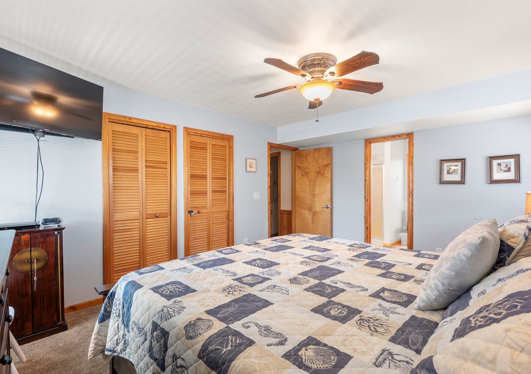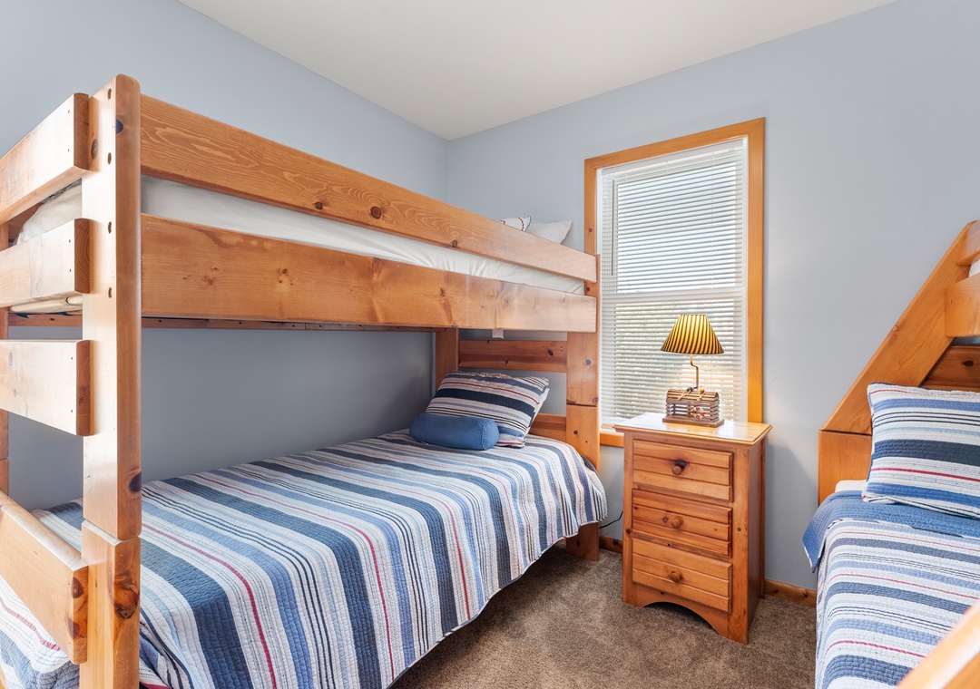 Step outside to enjoy your very own private pool, perfect for cooling off after a day in the sun. Inside, the middle level features a spacious king ensuite bedroom with a jetted tub, deck access, and a flat-screen TV. This level also includes a queen bedroom and a fun bunk room with a pyramid bunk and twin-over-twin beds, ideal for kids or extra guests. A full hall bath and a laundry closet add convenience to your stay.