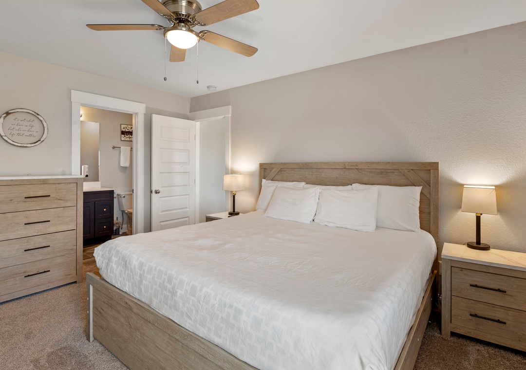The mid-level consists of two more bedrooms, both of which are ensuite for plenty of privacy. There's also a den with sleeper sofas that can serve as an additional common area or used for alternative sleeping arrangements. Downstairs, you'll find the fourth bedroom and full bath, along with a rec space for hanging out with family and friends. A wet bar with a full-size fridge is perfect for convenient snacks and drinks without having to go upstairs. The rec room leads directly out to the pool area, where you can take a refreshing dip or lounge in the sun. There's also a hot tub for a relaxing soak at the end of the day.