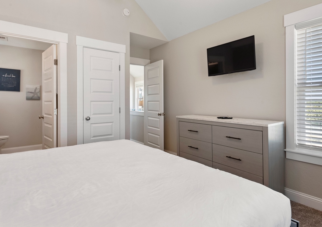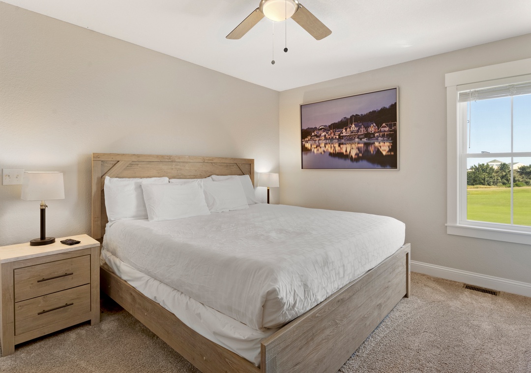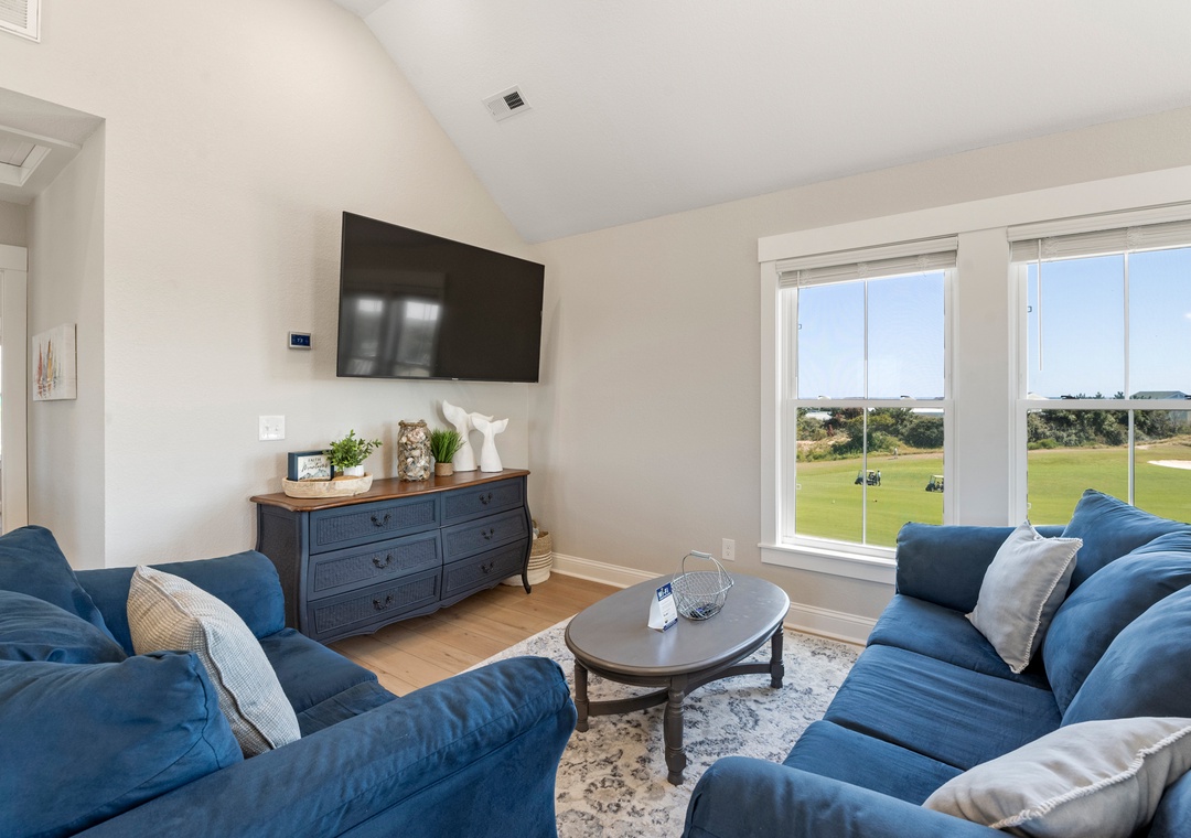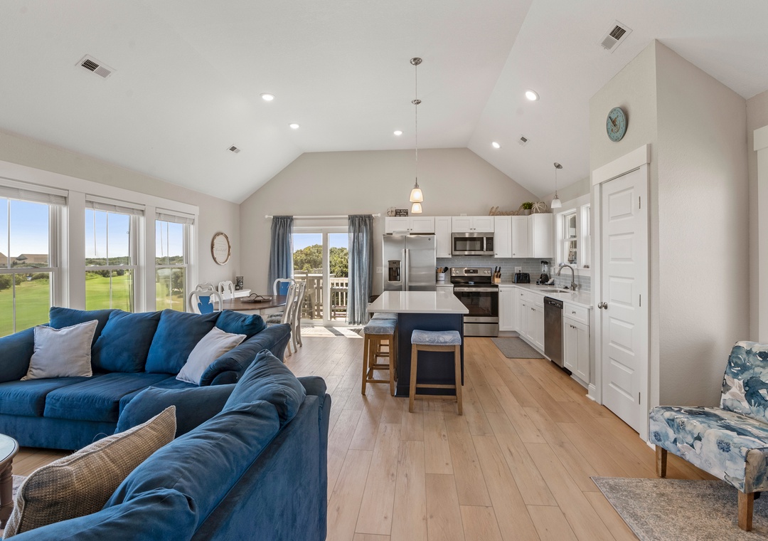 After a day at the beach or exploring the resort, come home and unwind in the tastefully furnished great room. A wall of east-facing windows showcases the views of the golf course, and vaulted ceilings make the space feel bright and airy. The dining area leads out to a sun deck that overlooks the fairway and private pool below. Back inside, embrace your inner chef while cooking in the well-equipped kitchen with stainless steel appliances and center island for plenty of prep space. The primary king bedroom is located on the top level just off the living area and includes an ensuite bath.