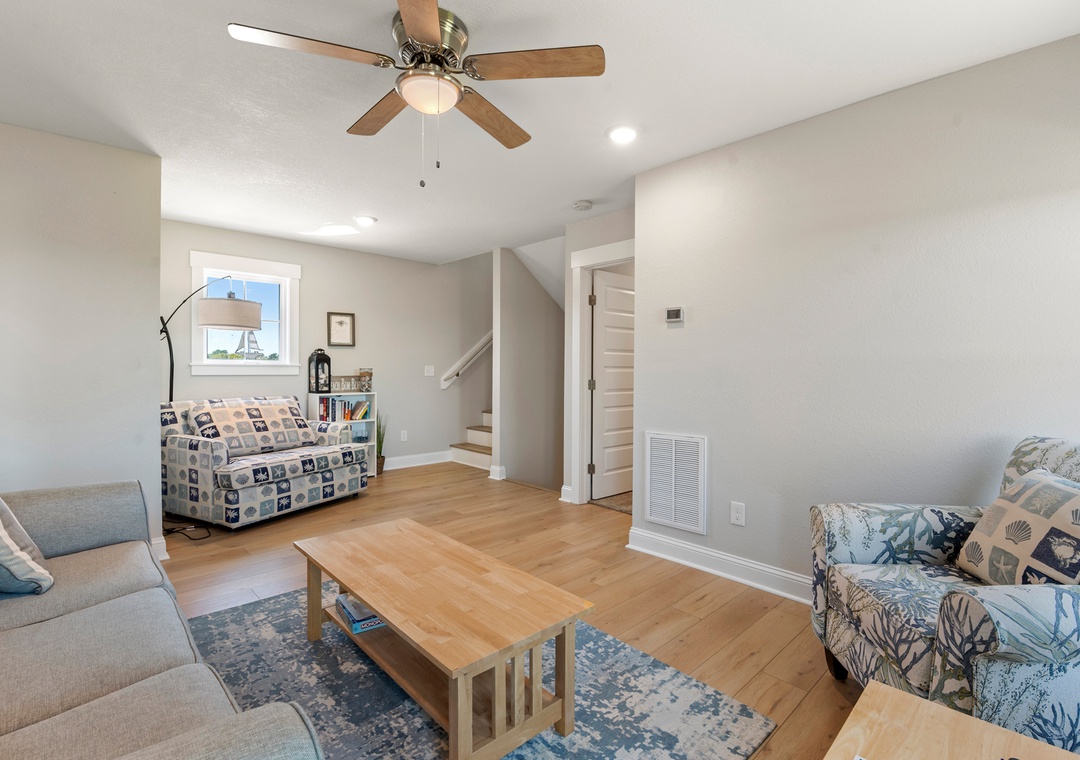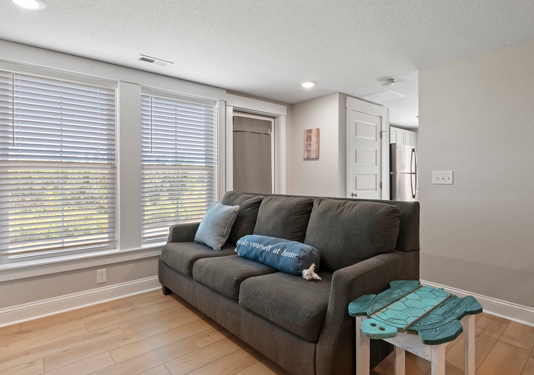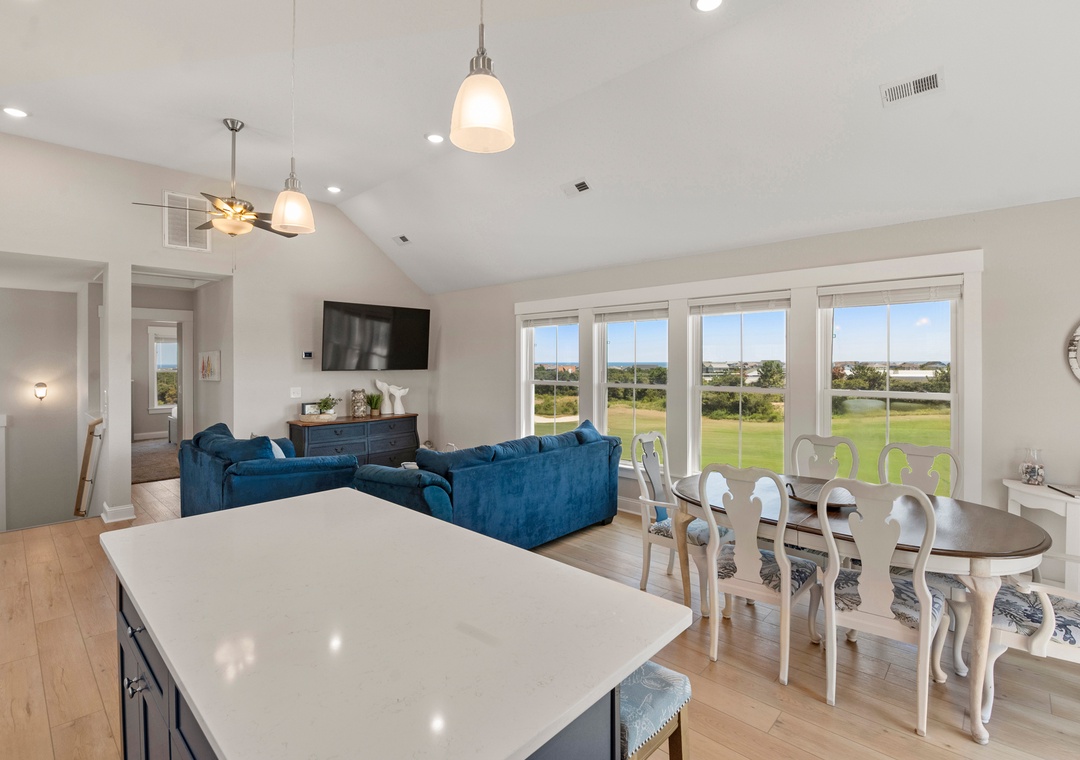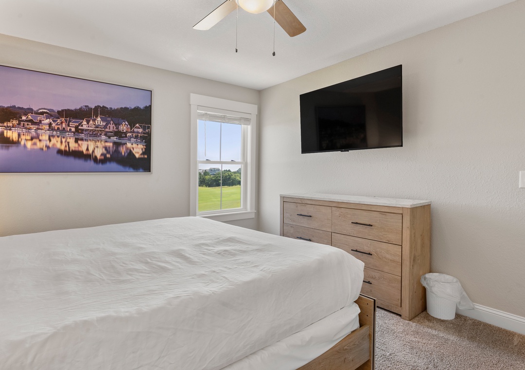 After a day at the beach or exploring the resort, come home and unwind in the tastefully furnished great room. A wall of east-facing windows showcases the views of the golf course, and vaulted ceilings make the space feel bright and airy. The dining area leads out to a sun deck that overlooks the fairway and private pool below. Back inside, embrace your inner chef while cooking in the well-equipped kitchen with stainless steel appliances and center island for plenty of prep space. The primary king bedroom is located on the top level just off the living area and includes an ensuite bath.